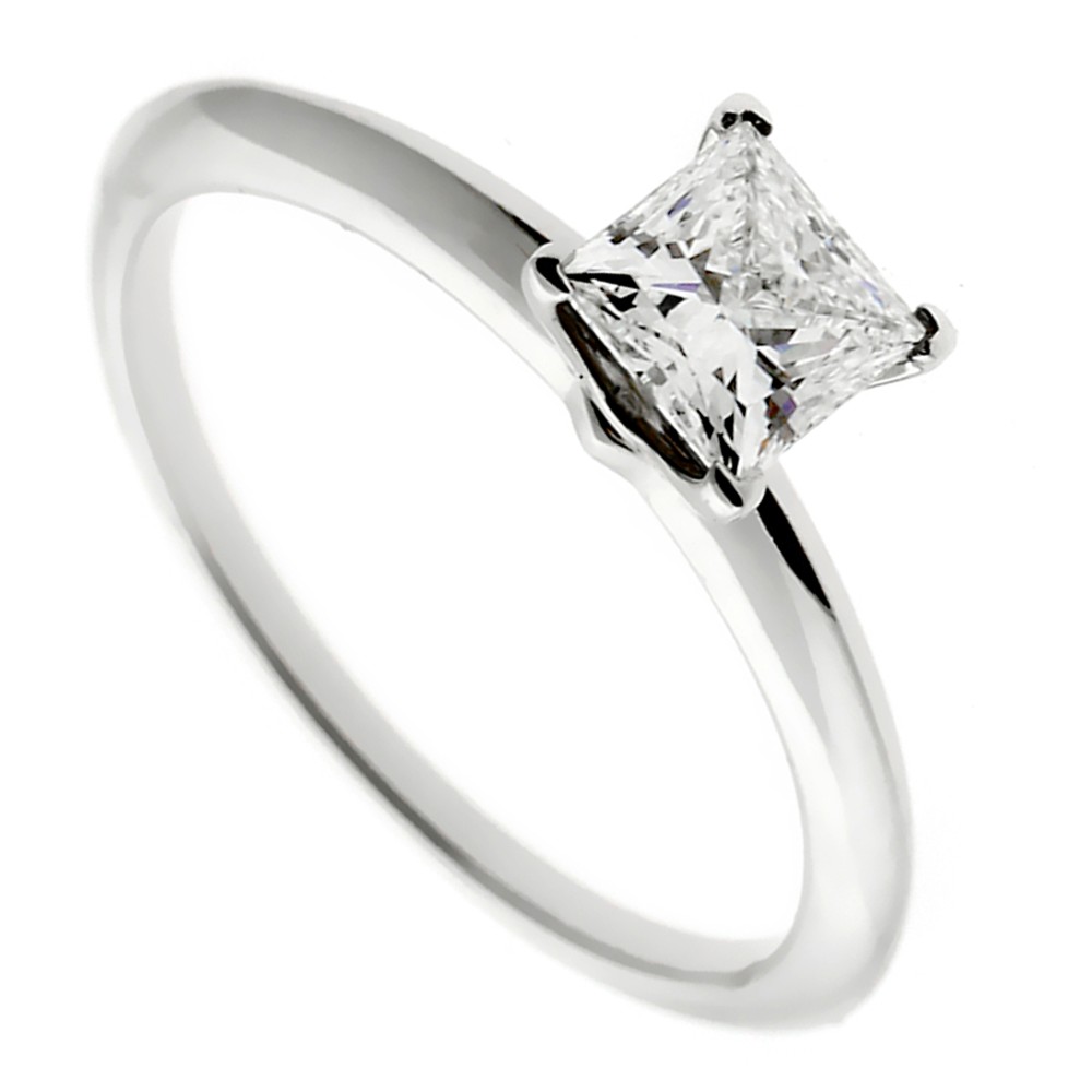 The platinum band centering a princess cut diamond.