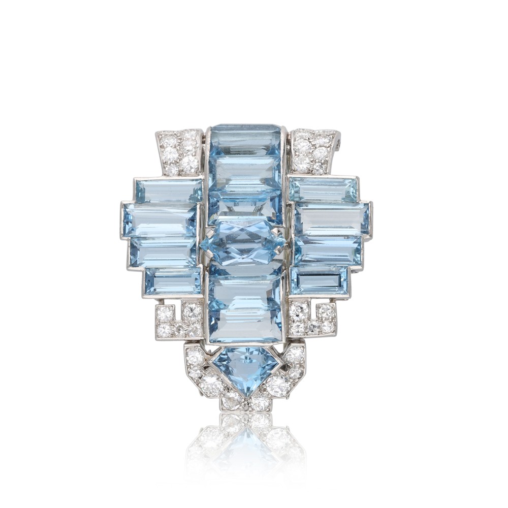 Composed of faceted aquamarines, accented by round diamonds.