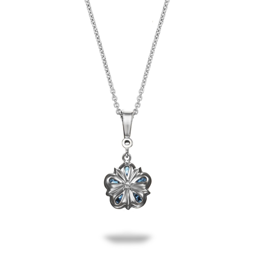 Comprising a floral motif inspired by Elizabethan England and featuring 5 aquamarines with 2 rose-cut diamonds, 2 in the center, all in a rub-over setting and 1 on the back.