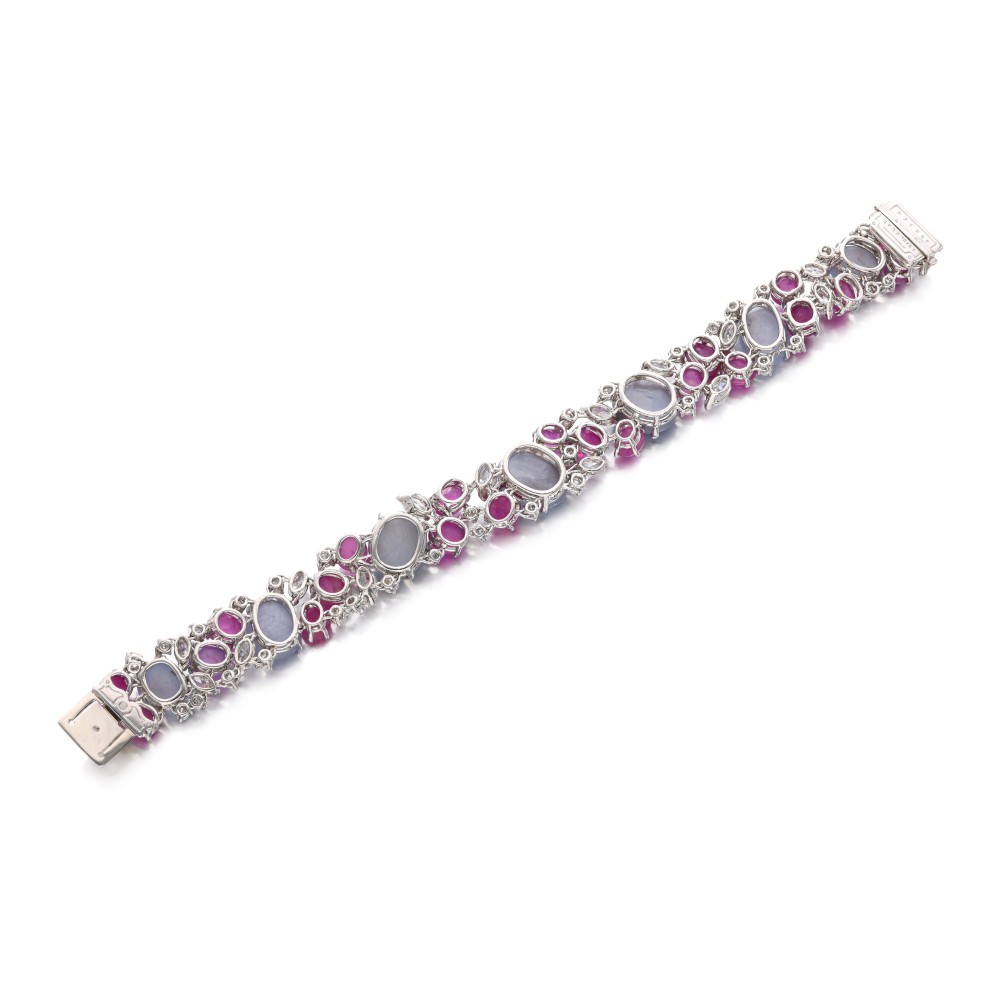 Composed of Ceylon star sapphires and star ruby cabochons, accented by marquise-shaped and round brilliant-cut diamonds.