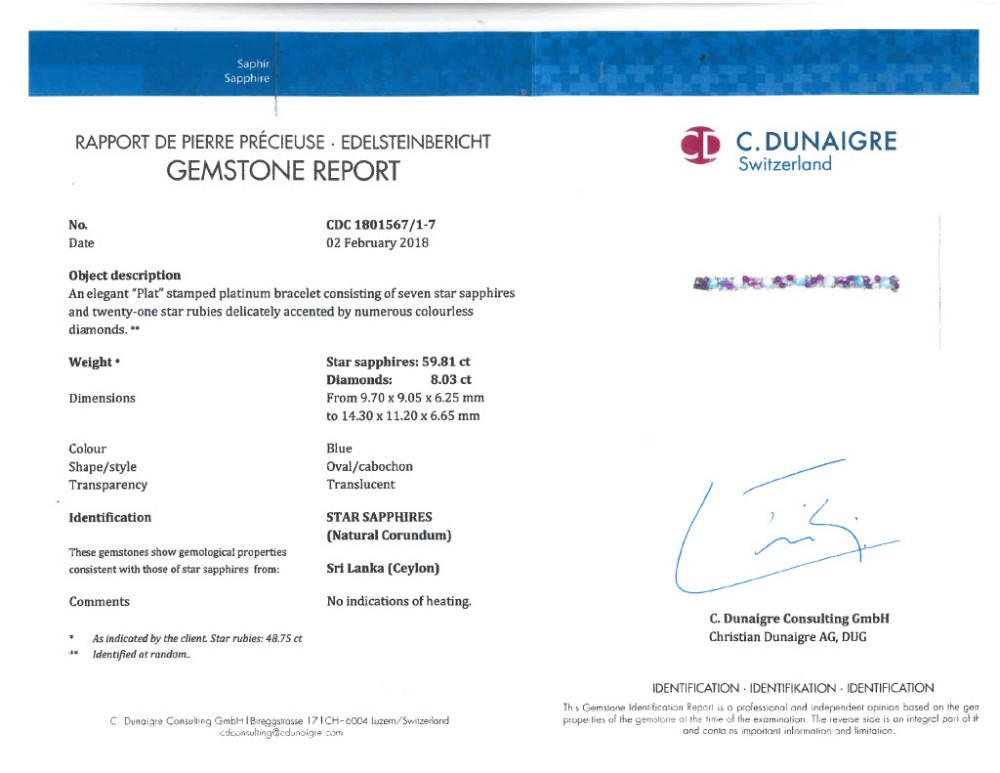 - Accompanied by C. Dunaigre report no. CDC 1801567/1-7, dated 2 February 2018, stating that the 59.81 carats of star sapphires are of Sri Lankan (Ceylon) origin and show no indications of heating