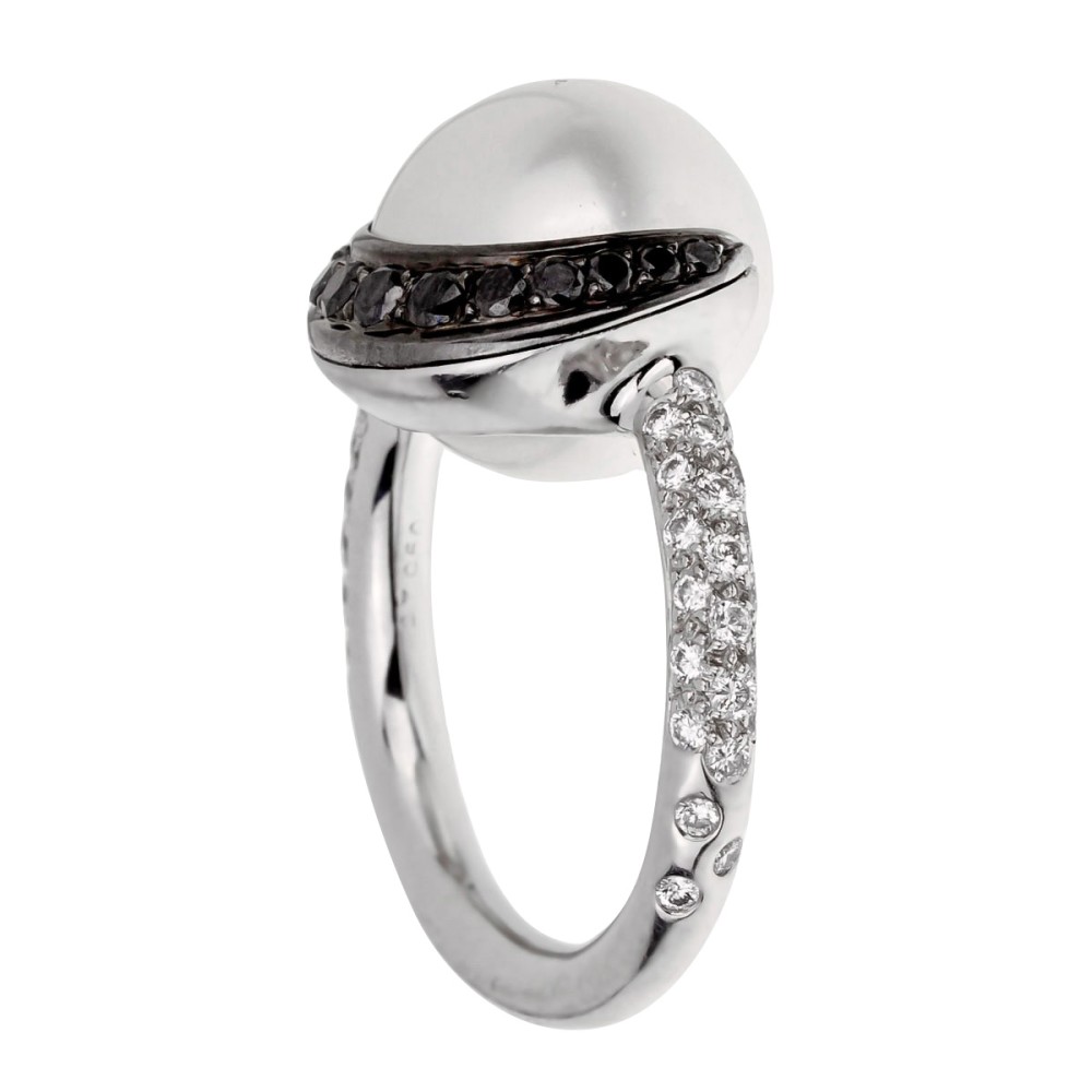 Centering a cultured pearl, surrounded by black diamonds and pav? diamonds on the shank.