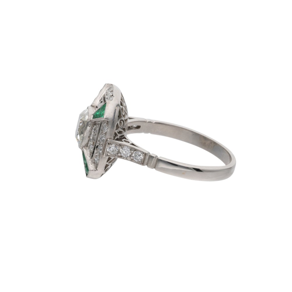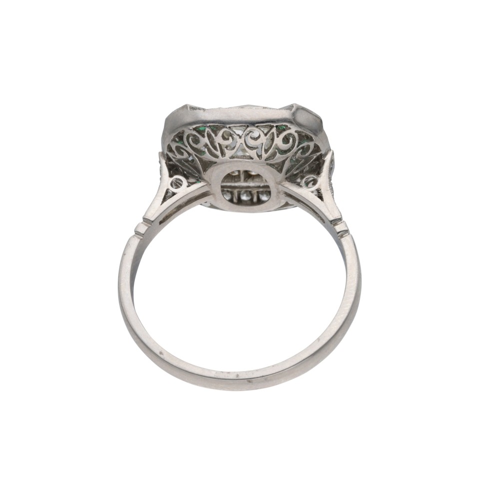 Composed of a cushion-shaped center diamond, accented by European-cut diamonds and enhanced by calibr?-cut emeralds.