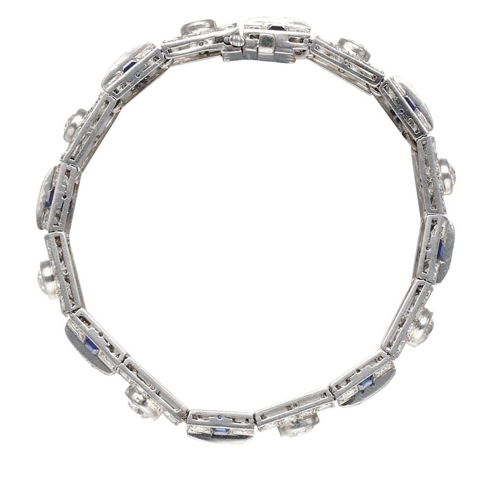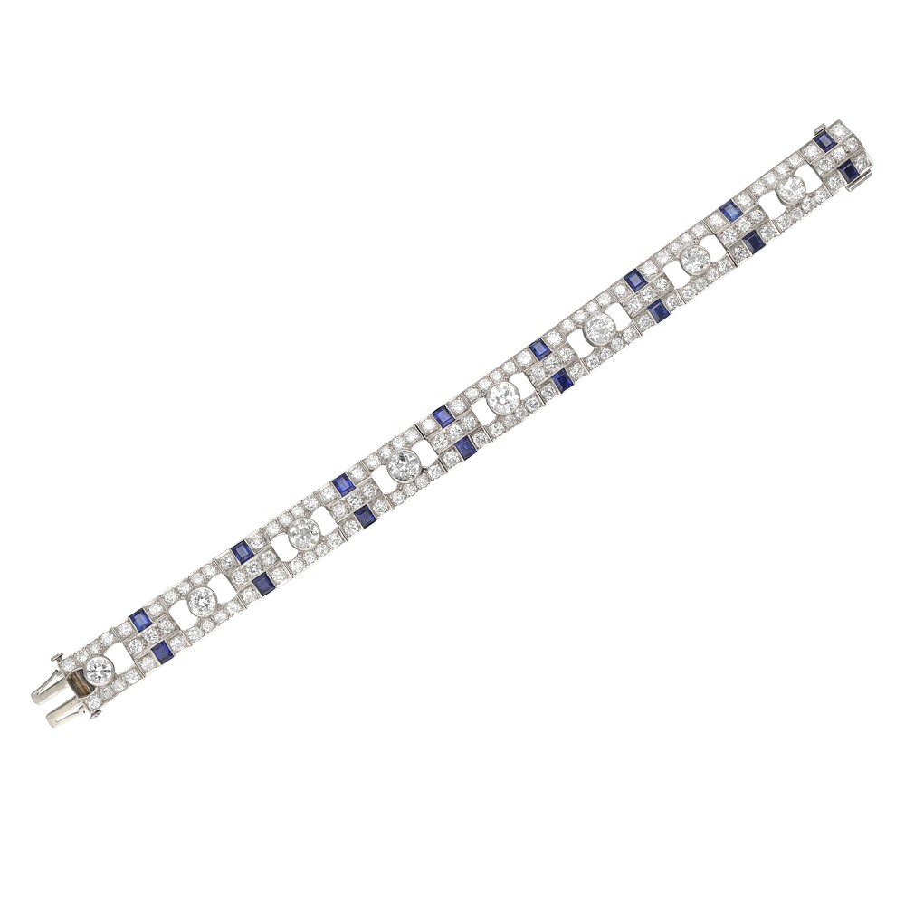 Composed of European and transitional-cut diamonds, accented by rectangle-shaped sapphires.