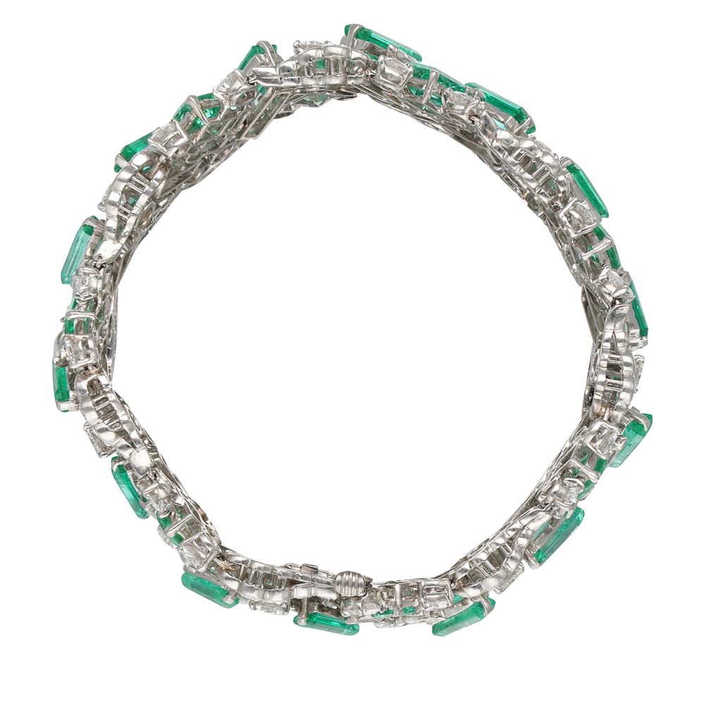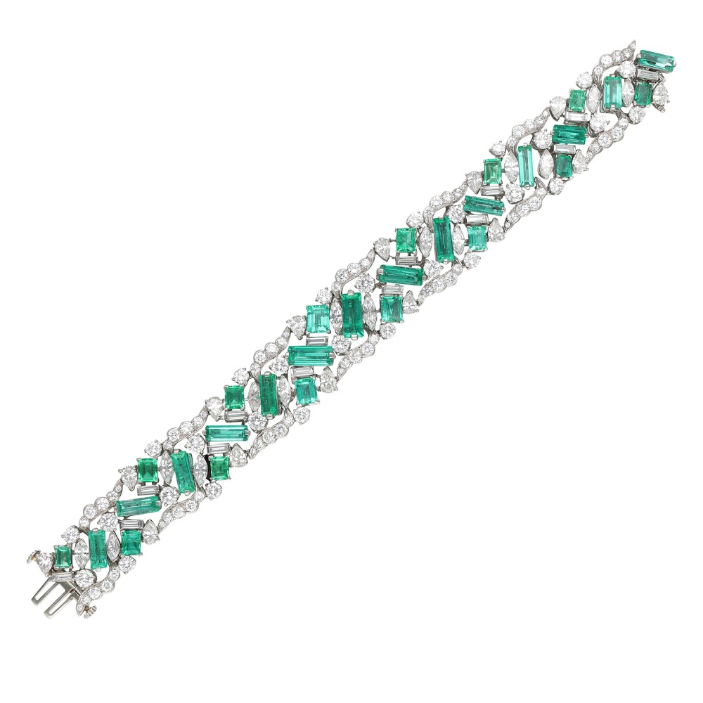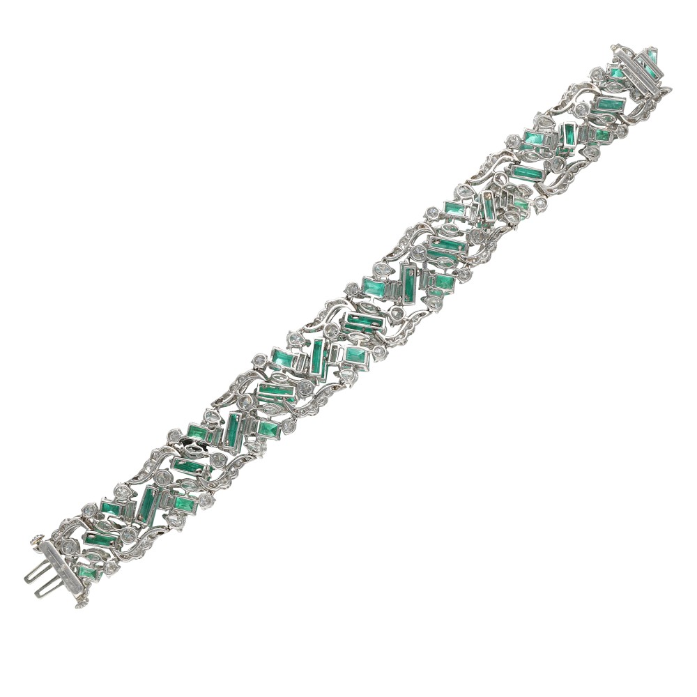 Composed of emerald-cut emeralds, accented by round brilliant, pear, baguette and marquise-shaped diamonds.