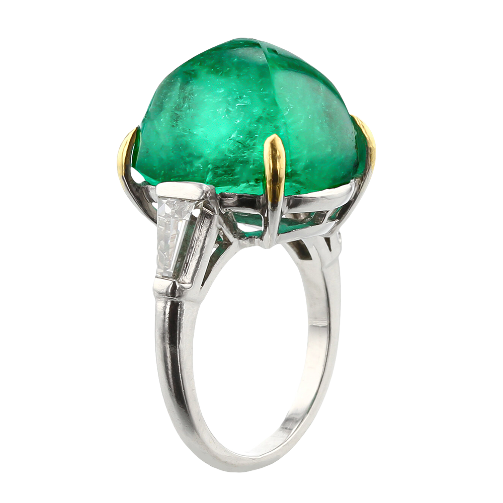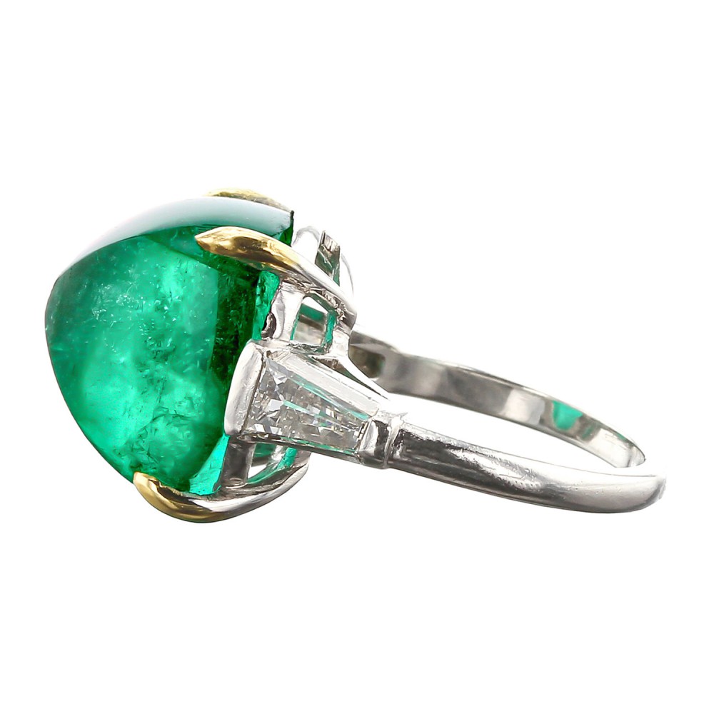 Featuring a green emerald sugarloaf cabochon flanked by two trapezoidal diamonds.
