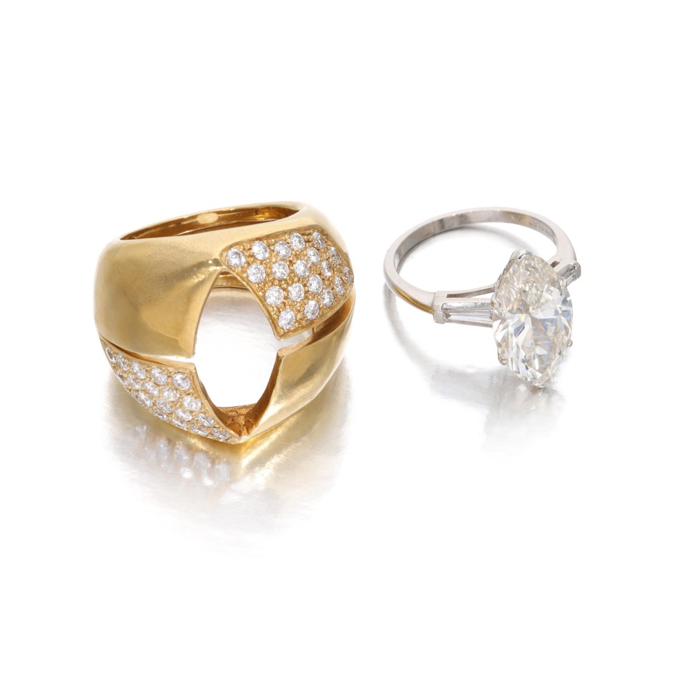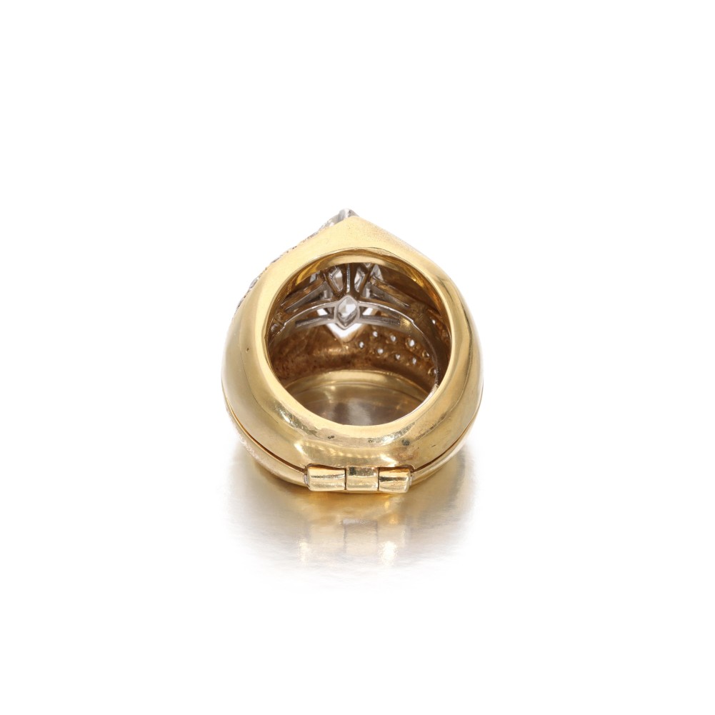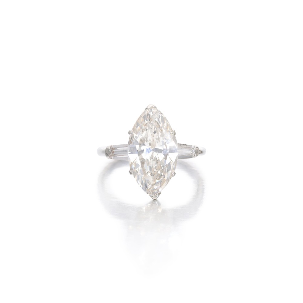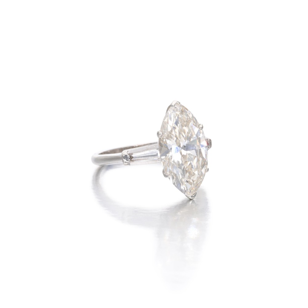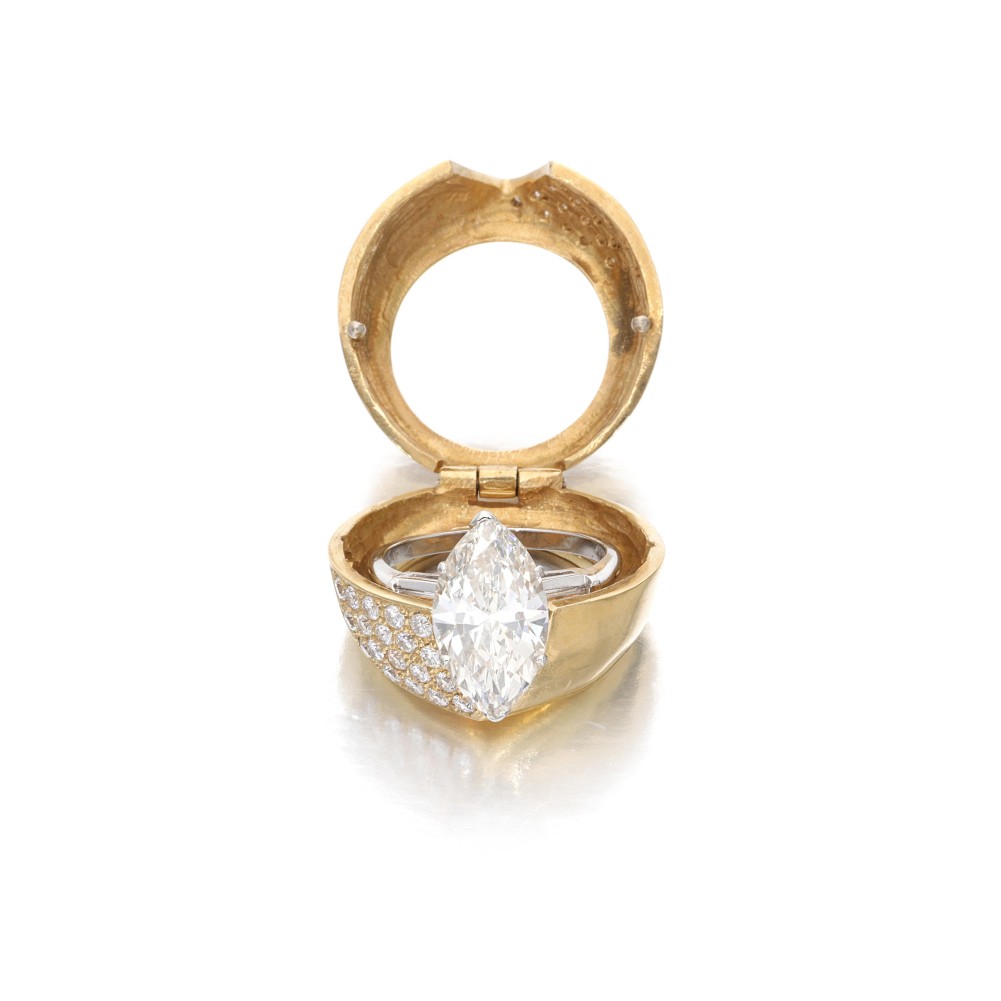 Composed of a marquise-shaped diamond, accented by tapered baguette-cut diamonds and enhanced by a removable yellow gold jacket with round brilliant-cut diamonds.