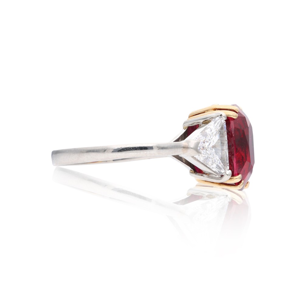 Centering a cushion shaped ruby, flanked by 2 trillion cut diamonds.