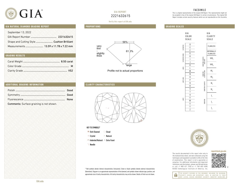 - Accompanied by GIA report no. 2221632615, dated September 13, 2022, stating the 8.50ct diamond is M color and VS2 clarity