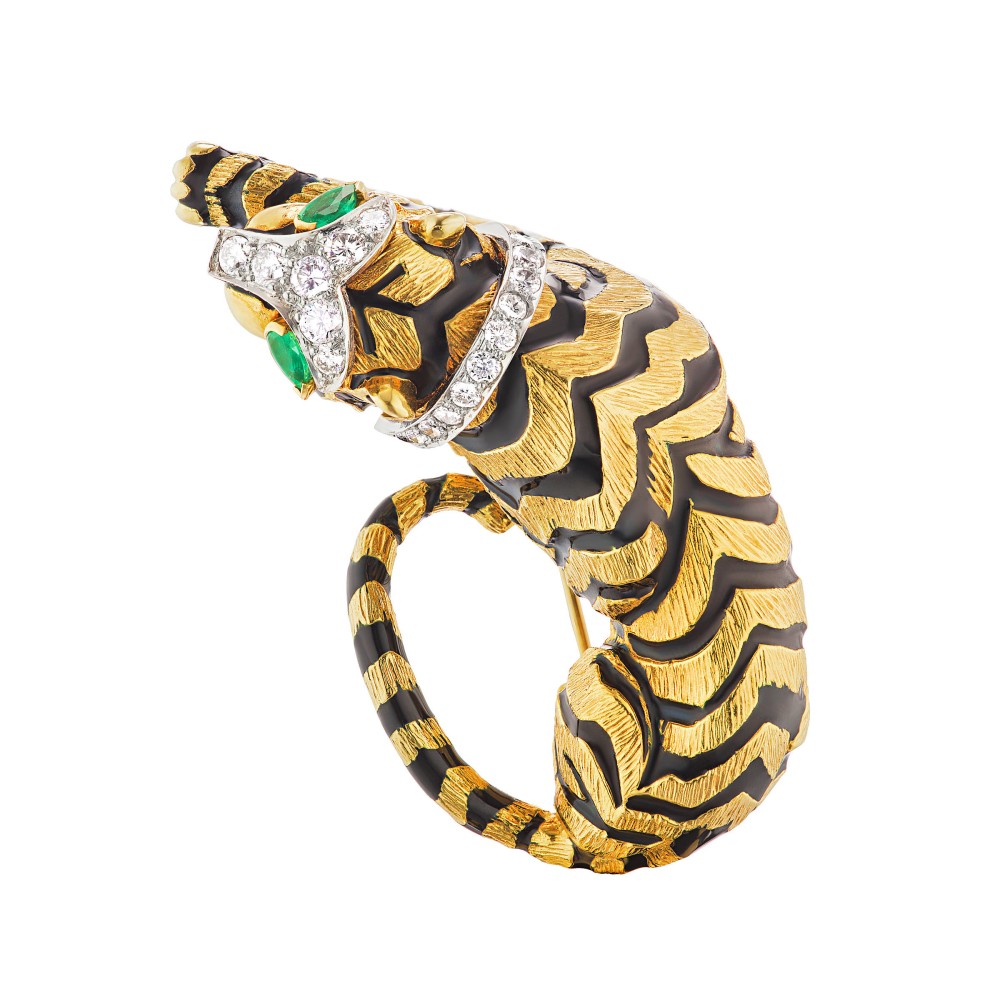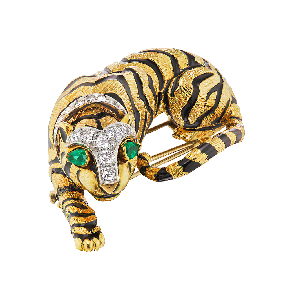 Designed as a tiger with black enameled stripes, pear-shaped emerald eyes, platinum forehead and collar accented by diamonds.