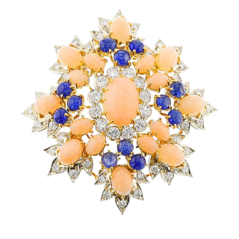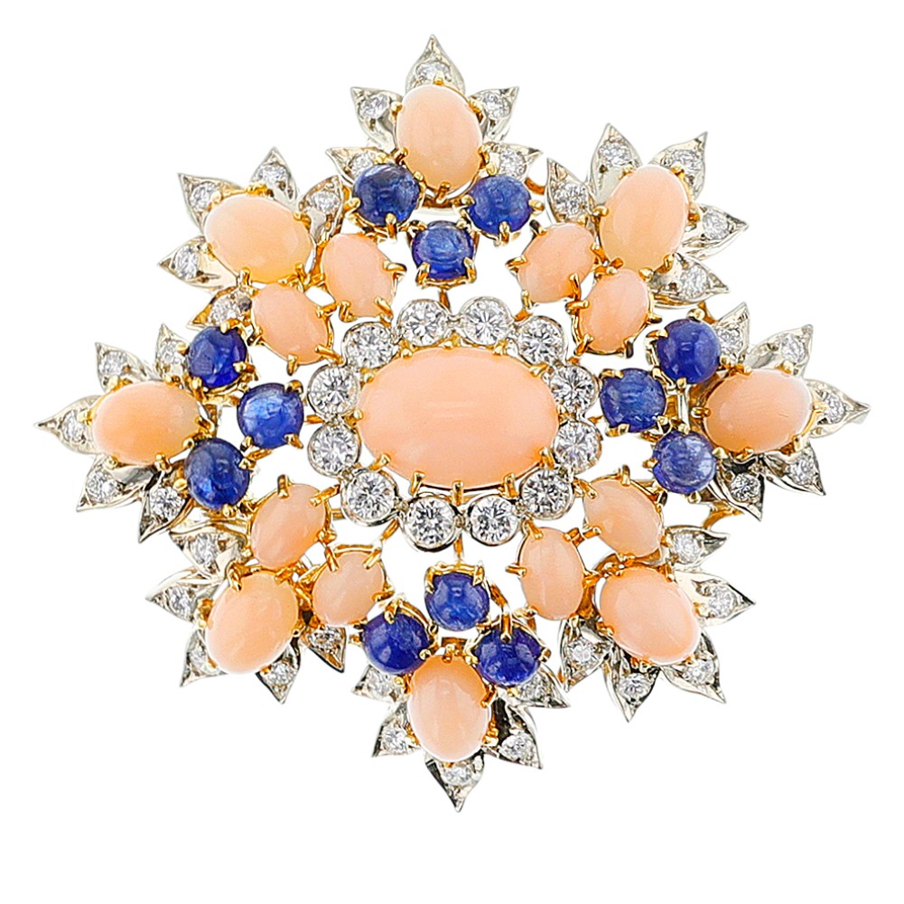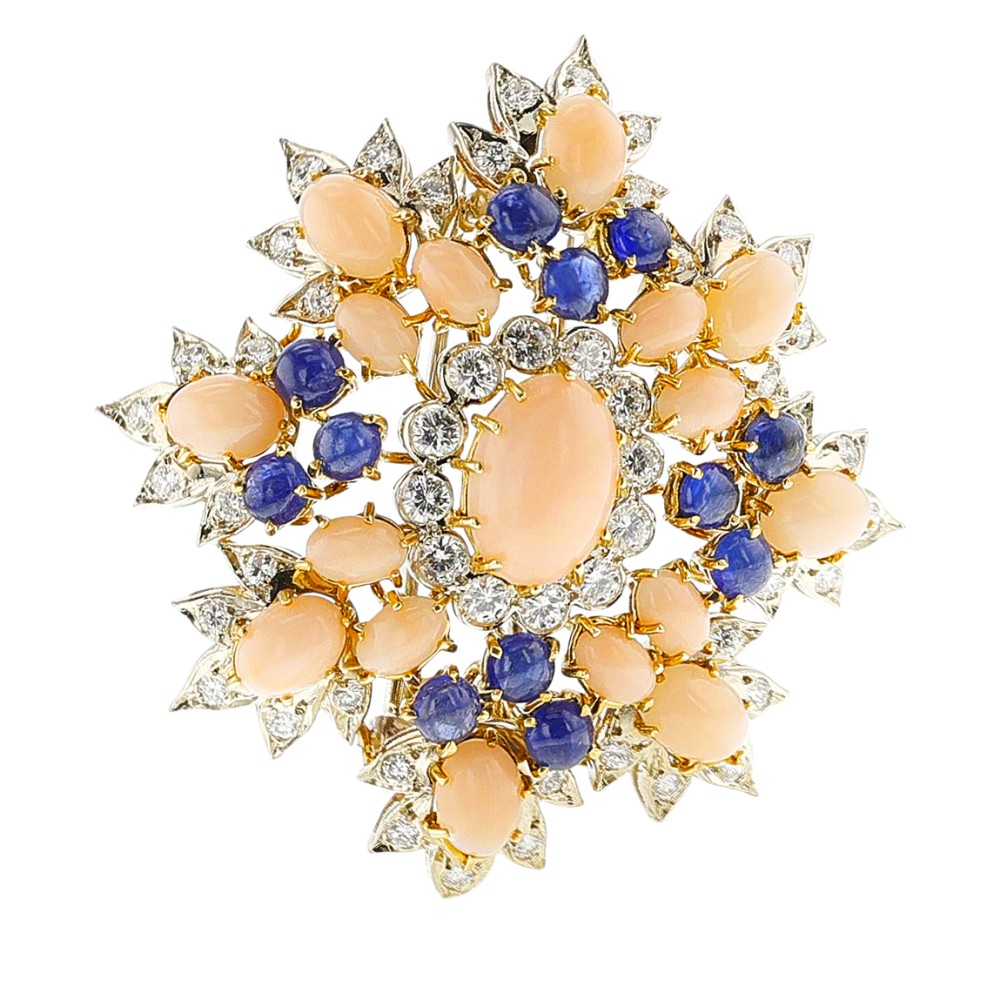 Centering an oval-shaped coral cabochon, surrounded by 11 round brilliant-cut diamonds, accented by additional 16 oval-shaped coral cabochons, round brilliant-cut diamonds and 12 sapphire cabochons.