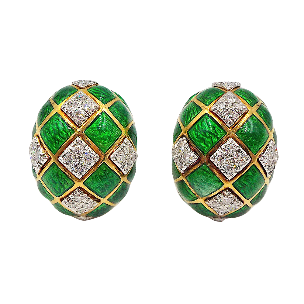 Of checkerboard design, set with green enamel and pav? diamonds.