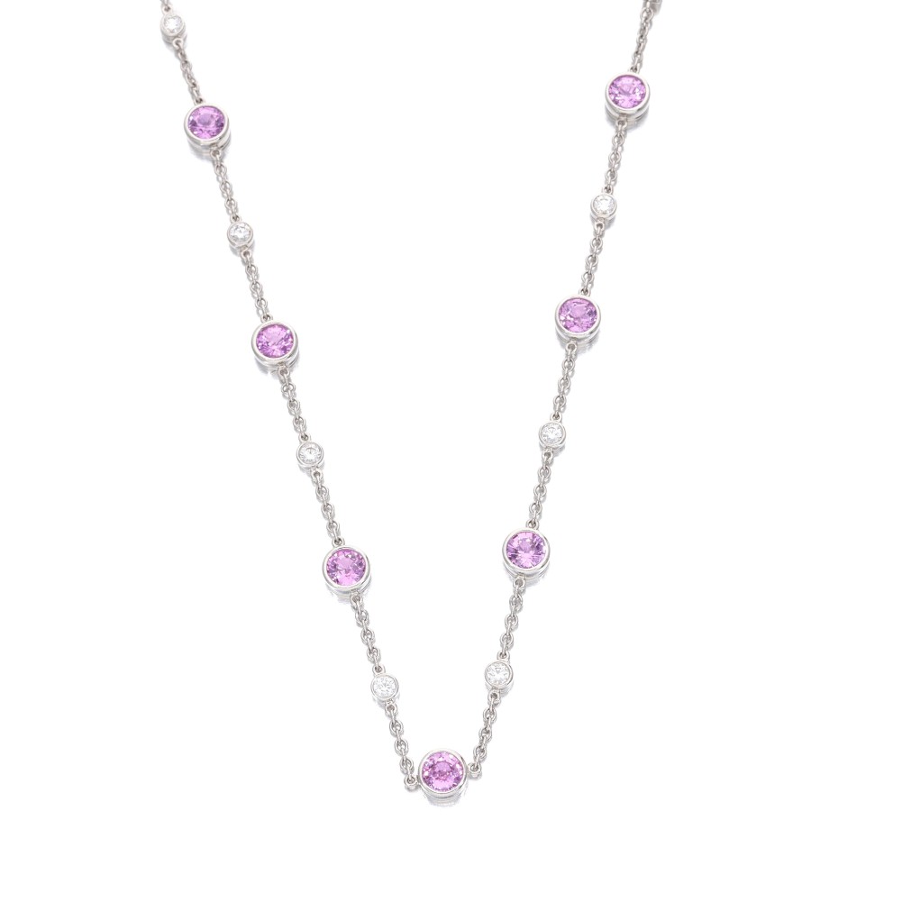 Composed of round brilliant-cut diamonds and round-cut pink sapphires.
