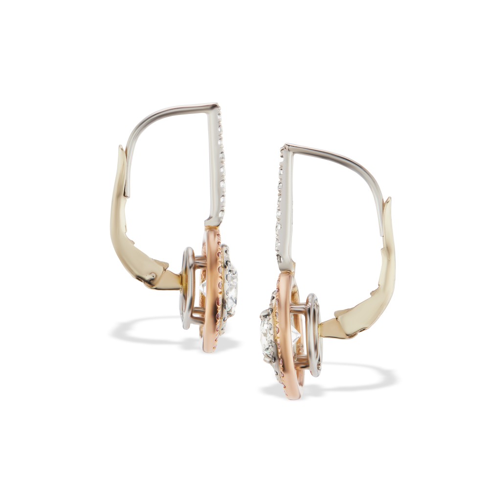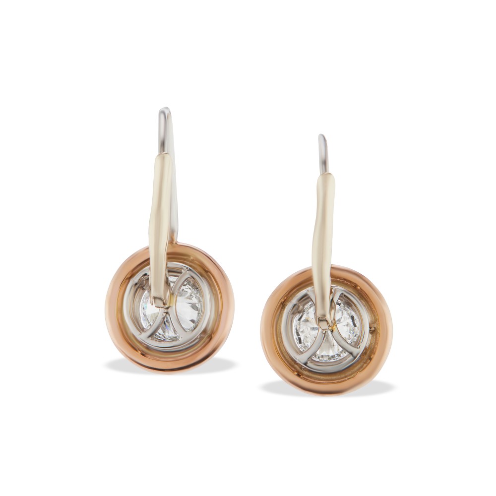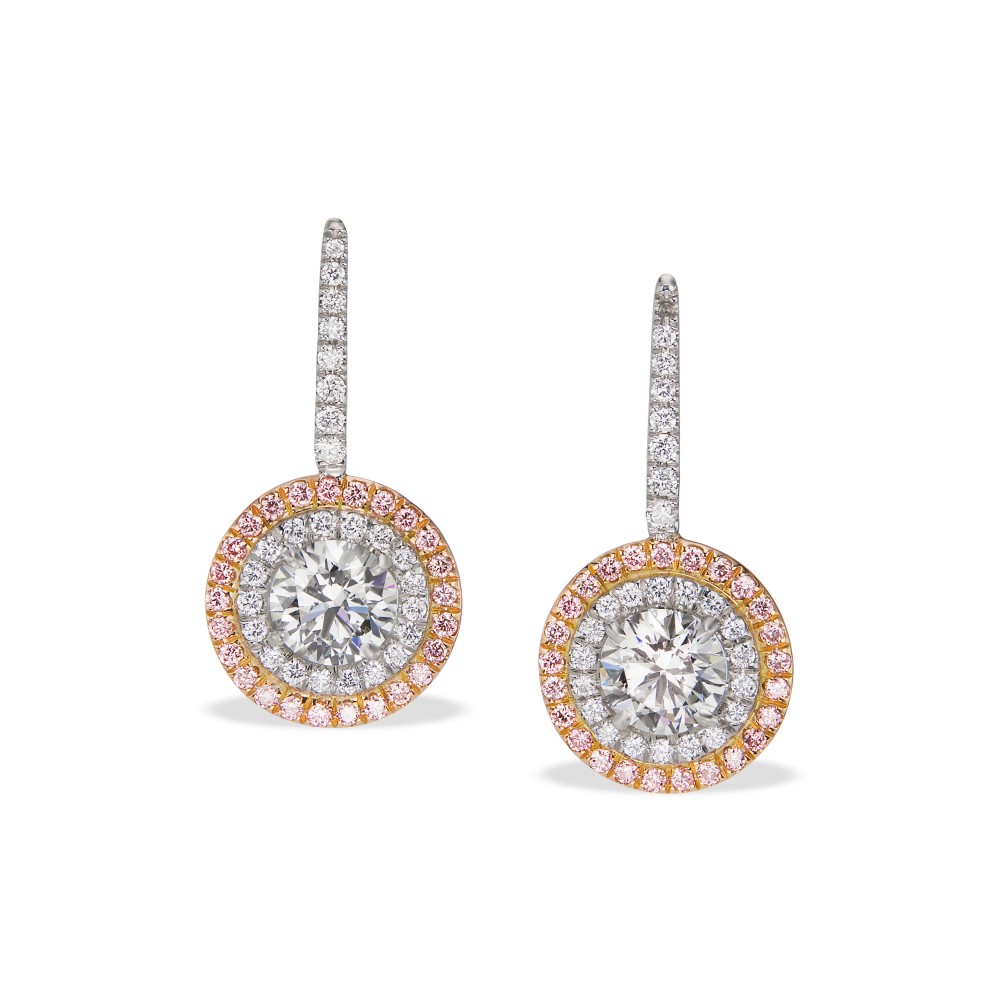 Each suspending a round diamond, framed and accented with diamonds and diamonds of pink hue.
