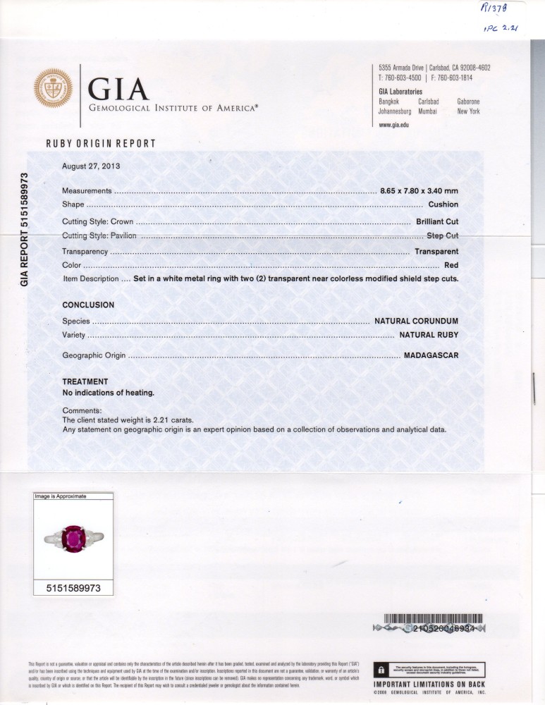 - Accompanied by a GIA report no. 5151589973, stating that 2.21 carat cushion-shaped natural ruby is originated from Madagascar, and has no indications of heating