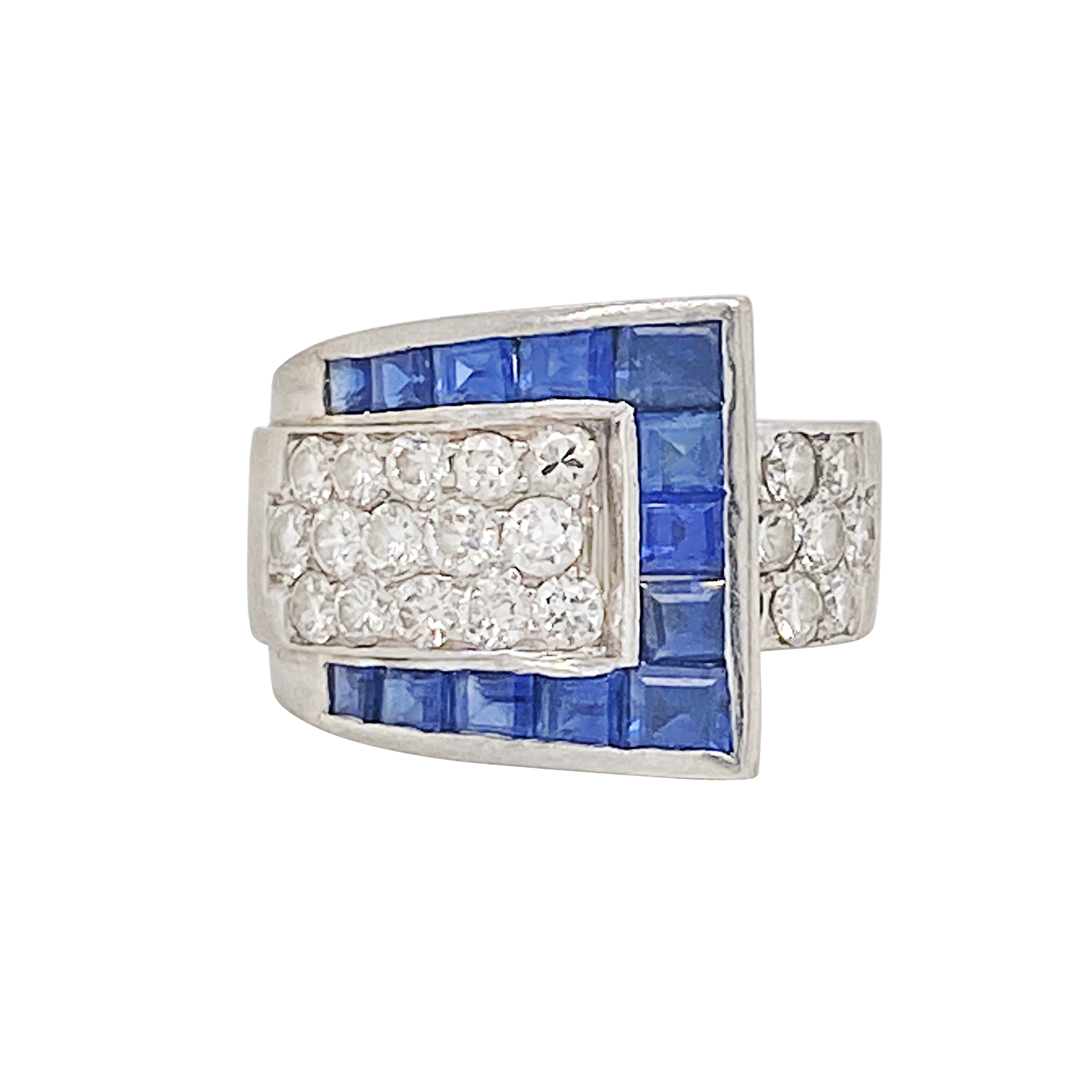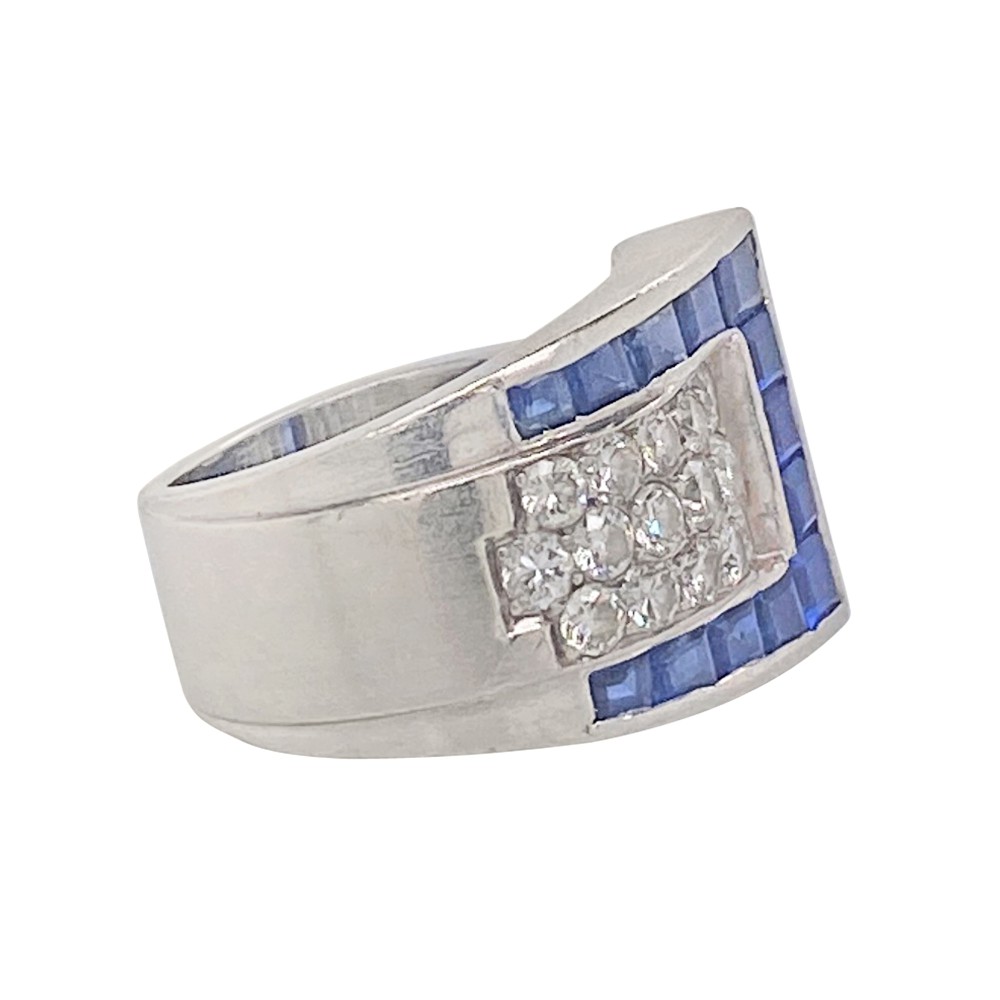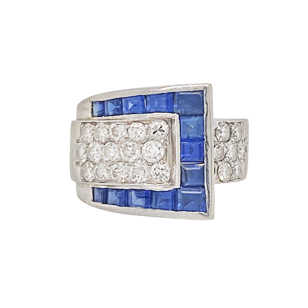 Of buckle motif design, set with sapphires and diamonds.
