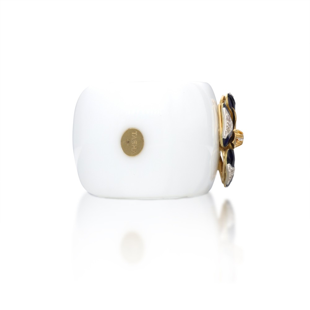 Composed of European-cut diamonds set in an enamel flower mounted on a white chalcedony cuff.