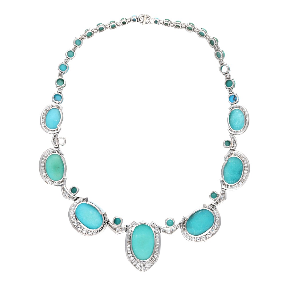 Composed of turquoise cabochons, accented by round and baguette cut diamonds.