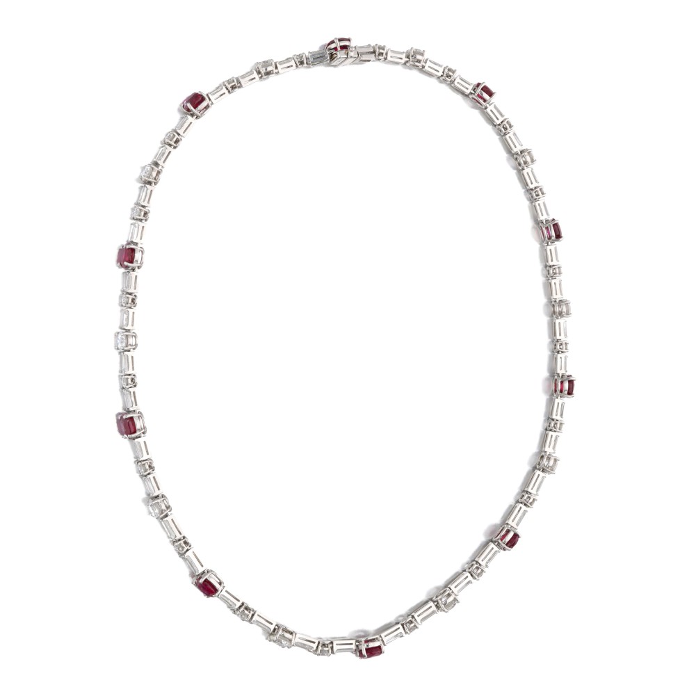 Composed of 10 round- and oval-shaped Burma rubies, accented by 30 round diamonds and 40 tapered baguette diamonds.