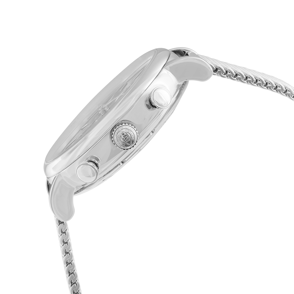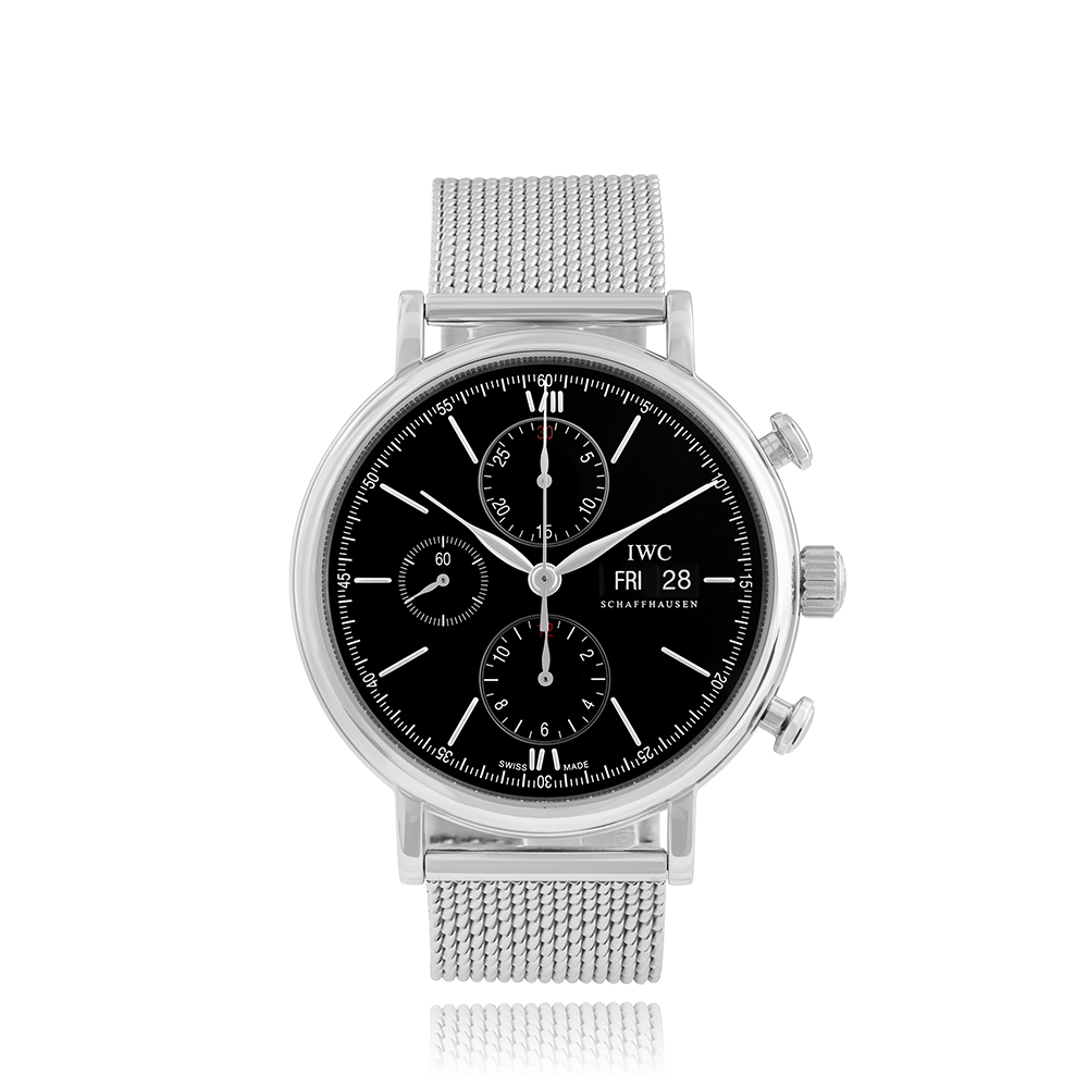 IWC Schaffhausen Portofino with a 42 mm stainless steel case and a sapphire glass, water-resistant; inside is the automatic caliber 79320, chronograph as additional function, a black index face date/day indication, the bracelet is a steel metal bracelet; accessory: Bucherer box.