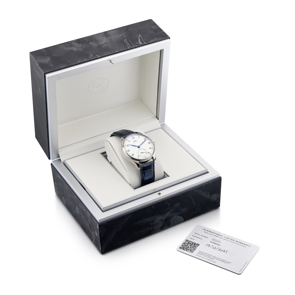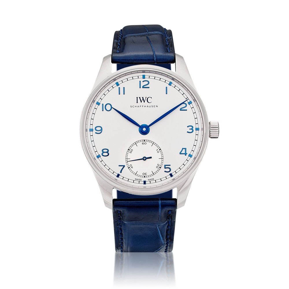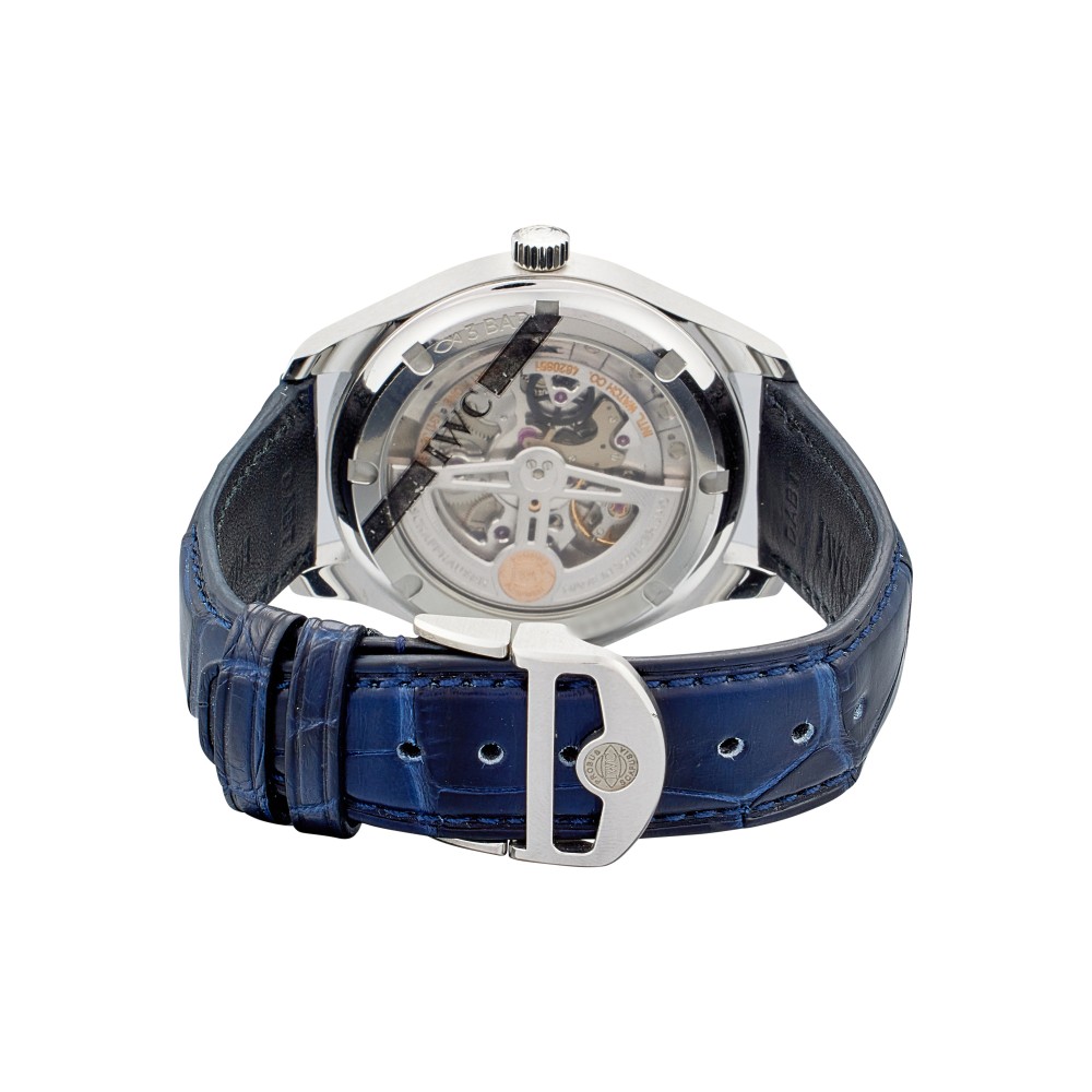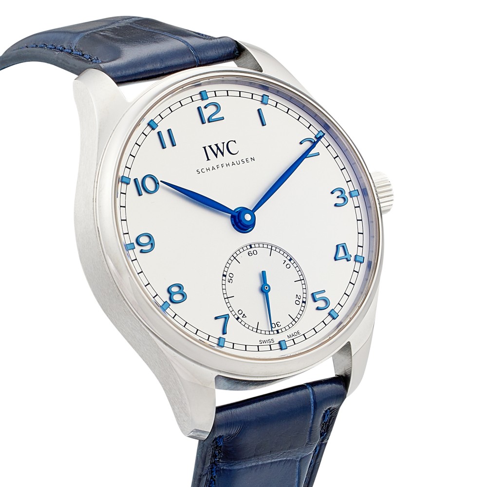 The Portugieser Automatic 40 presents the iconic Portugieser design in a compact case with a diameter of 40 millimeters. A clearly organized and open dial, with the characteristic minutes scale and the small seconds at “6 o?clock”; IWC?s Reference 325 in the late 1930s established a classic design idiom that has run as a common thread through the history of the Portugieser family ever since. Now the timelessly modern design returns to the collection in a new automatic model with a compact case diameter of 40 millimeters. The Portugieser Automatic 40 is powered by the IWC-manufactured 82200 caliber. This robust, high-quality automatic movement has a Pellaton winding system with components made of virtually non-wearing ceramic, which builds up a power reserve of 60 hours. This model features a stainless-steel case, a silver-plated dial, as well as blue hands and appliqu?s. It is fitted with a blue alligator leather strap. This watch comes with a full set of paper and box.