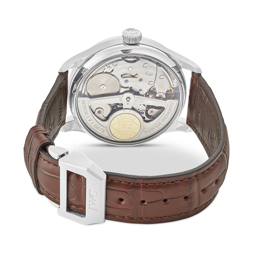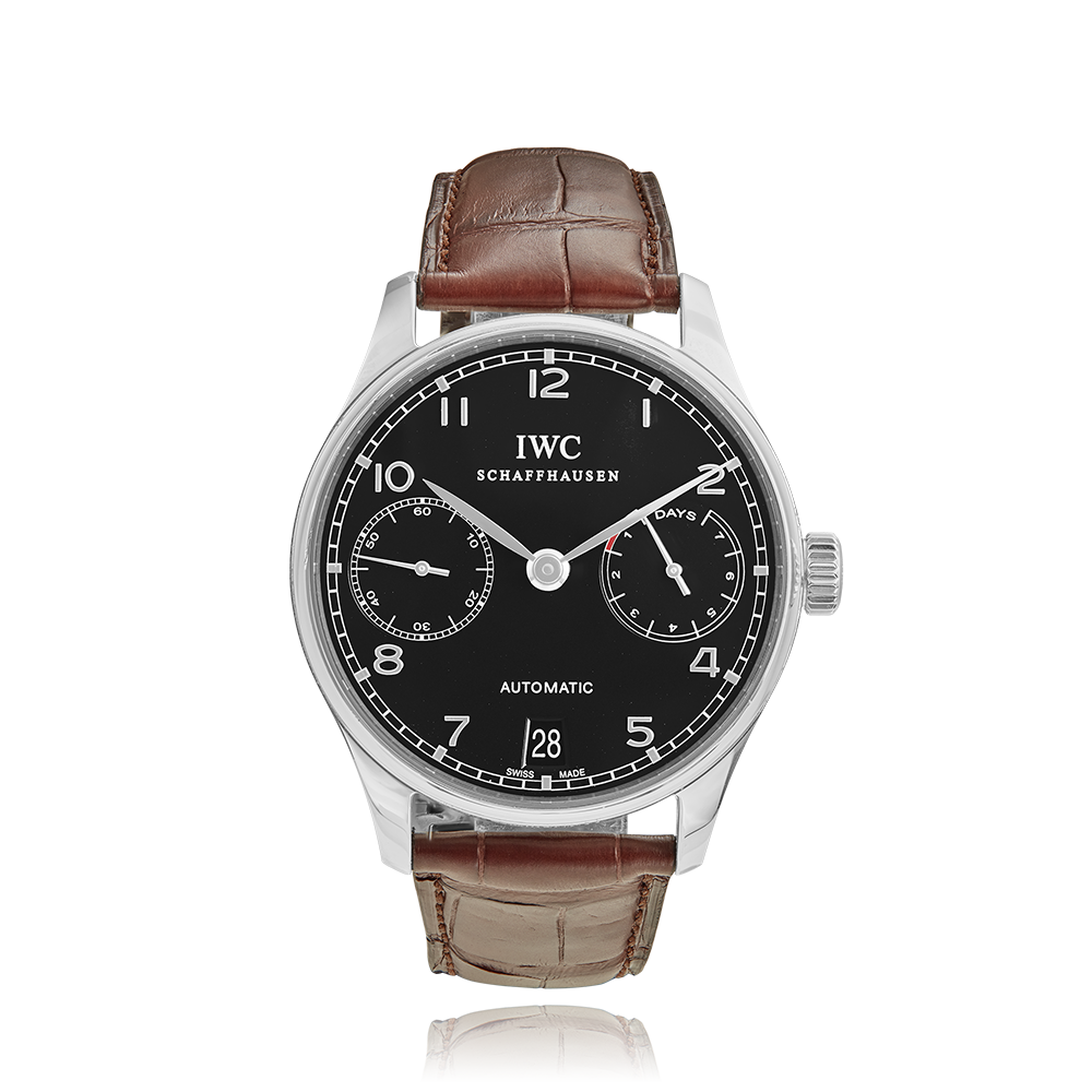 IWC Schaffhausen Portugieser with a 42 mm stainless steel case and a sapphire glass, water-resistant; inside is the automatic caliber 50010/51010/51011, power reserve as additional function, a black Arabic face with date indication, the bracelet is an alligator leather; accessories: sales box (original), sales guarantee (original).
