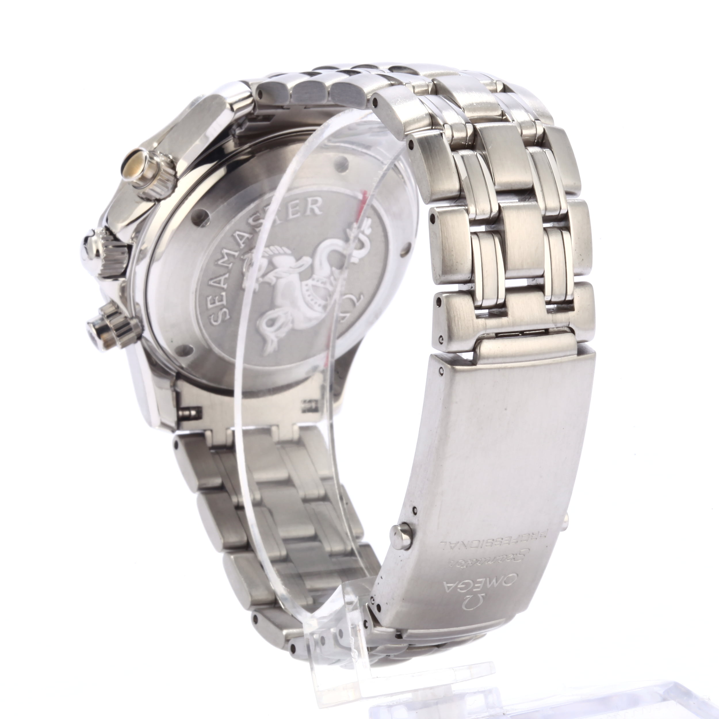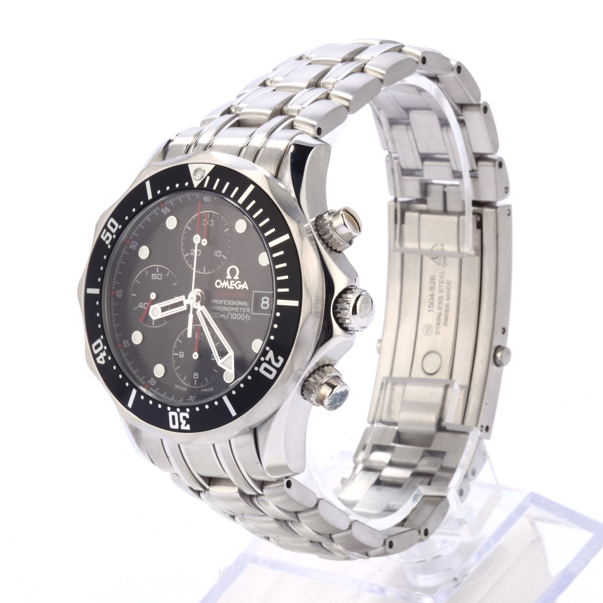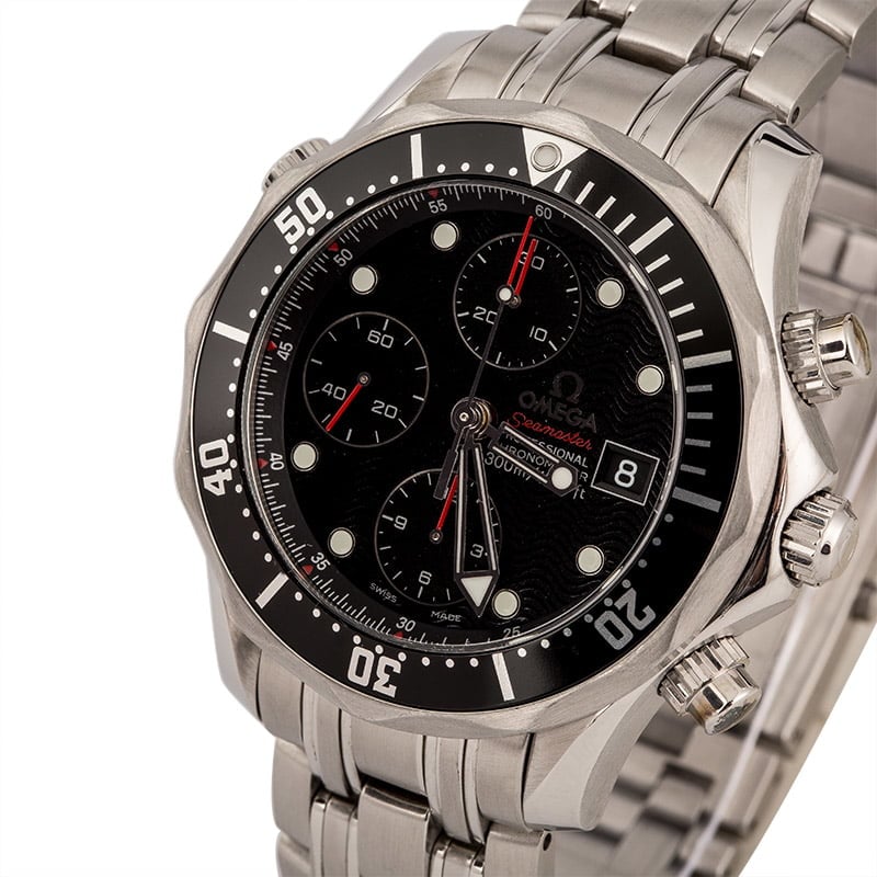The Omega Seamaster Chronograph is just one of the many impressive dive watches that the brand has developed over the years. Waterproof up to 300 meters and equipped with an Omega calibre 1164 movement with chronograph functions, the ref. 213.30.42.42.40.01.001 is the perfect companion for adventures on land or while at sea. Its feature set also includes a resilient stainless steel finish, domed and anti-reflective scratch-resistant sapphire crystals on the case back and front, a unidirectional timing bezel, and a luminous display on the dial. The case is also outfitted with a Helium Escape Valve, allowing it to withstand immense pressures while keeping the crystals in-tact. Measuring 41.5mm in diameter and presented on a multi-link bracelet, the Seamaster Chronograph is bold yet very wearable tool watch.