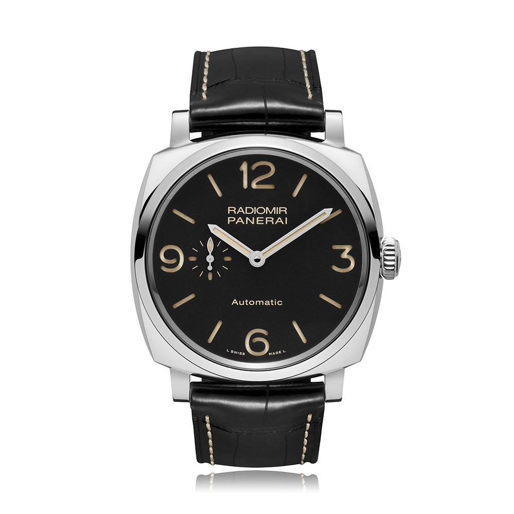 Panerai Radiomir 1940 with a 45 mm stainless steel case and a sapphire glass, water resistant; inside is the automatic calibre p.4000, small-seconds subdial as additional function a black arabic / index face without date indication, the bracelet is a bovine leather; accessory: sales guarantee (original), sales box (original).