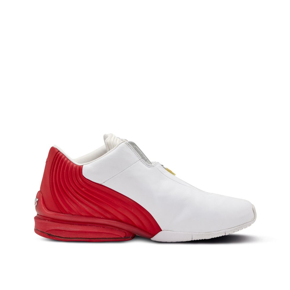 - Both pairs feature white leather uppers with red accents and branding.