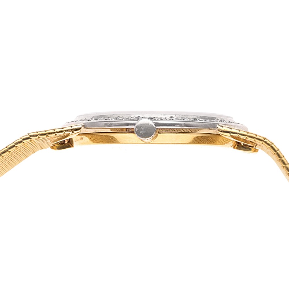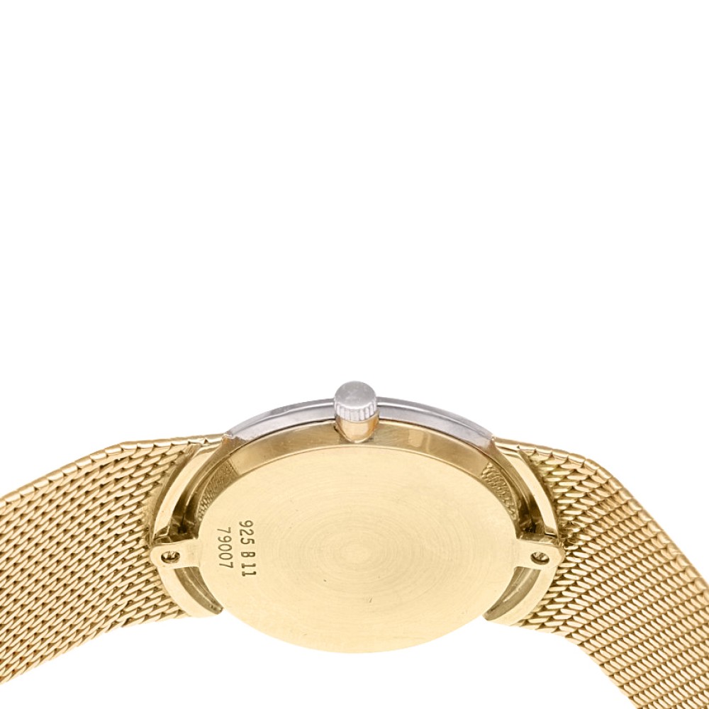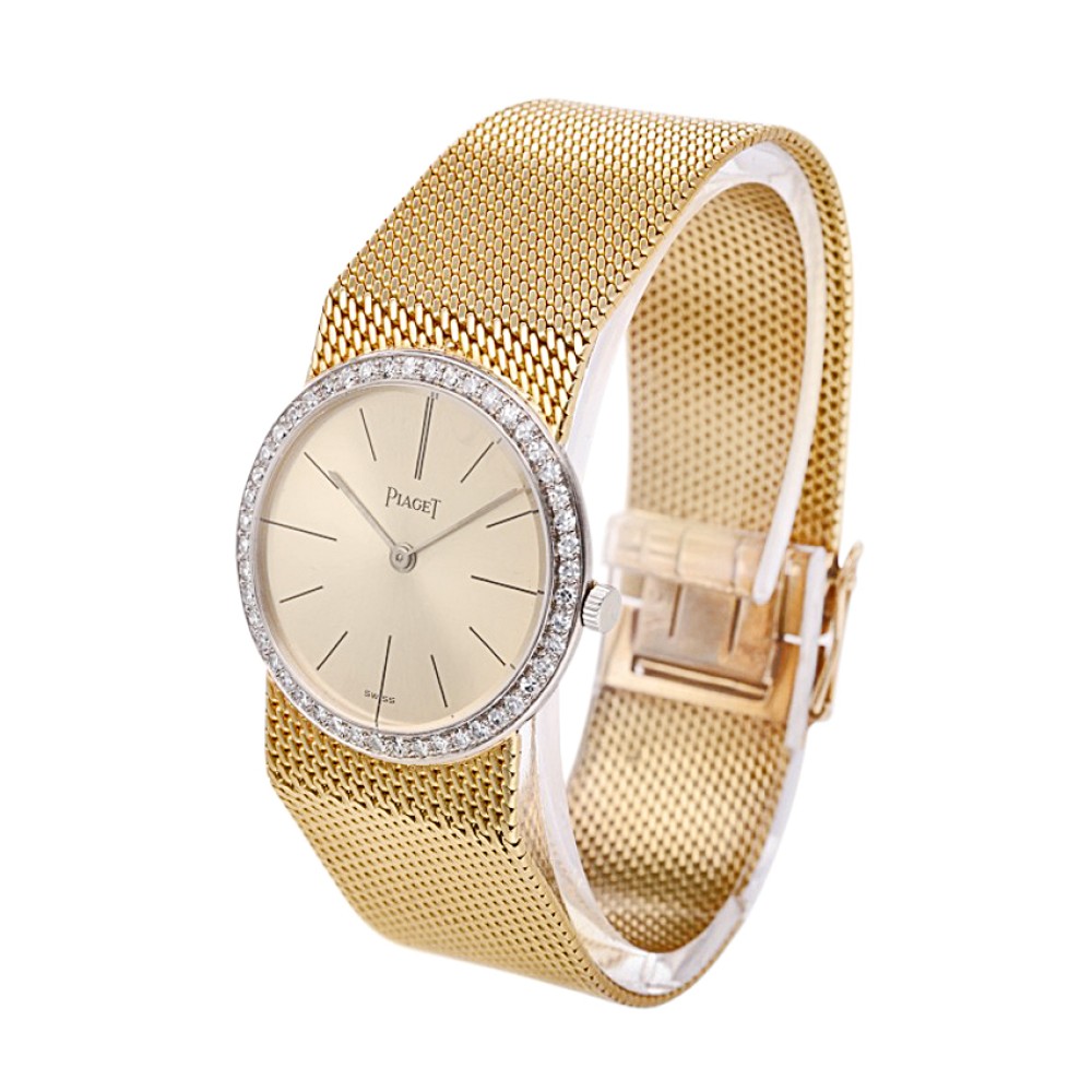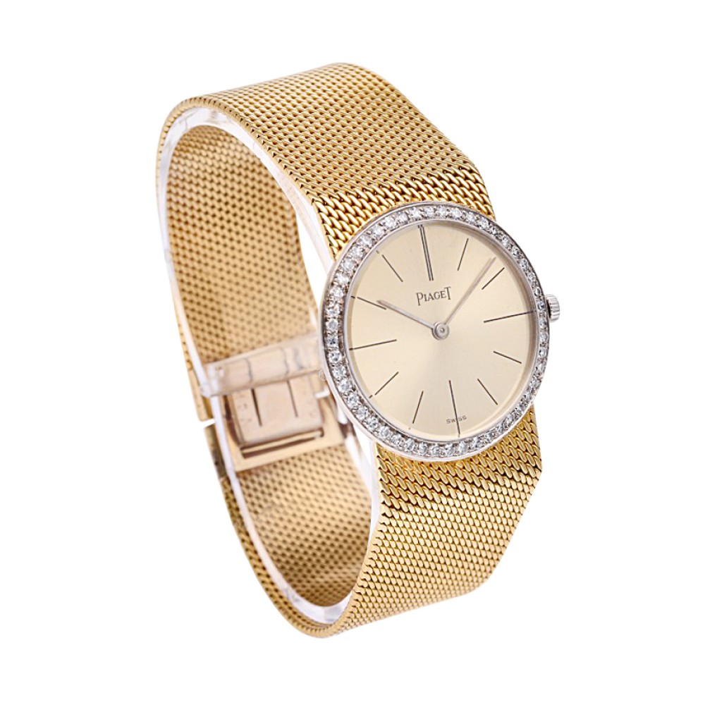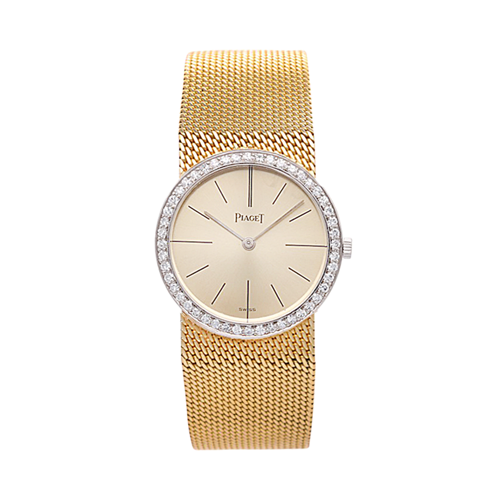 Piaget has become the master in creating timeless and elegant dress watches for women, and this Reference 7900 is not an exception. The classic timepiece features a beautiful gold dial with a diamond-set bezel accompanied by an integrated textured yellow gold bracelet.