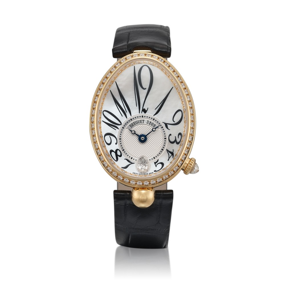 Breguet was founded in 1775 by Abraham-Louis Breguet, a Swiss watchmaker born to Huguenot parents in Neuch?tel. He studied watchmaking for 10 years under Ferdinand Berthoud and Jean-Antoine L?pine before setting up his own watchmaking business at 51 Quai de l’Horloge on the ?le de la Cit? in Paris. This Reine de Naples Reference 8918BA/58/964/D00D is a yellow gold automatic wristwatch, automatic movement, 18K yellow gold case with diamond-set. Case size in diameter 36.5 x 28.45 mm. 18K yellow gold folding buckle with diamond-set. Black alligator strap. Mother-of-pearl dial with diamond. This watch comes with paper only.