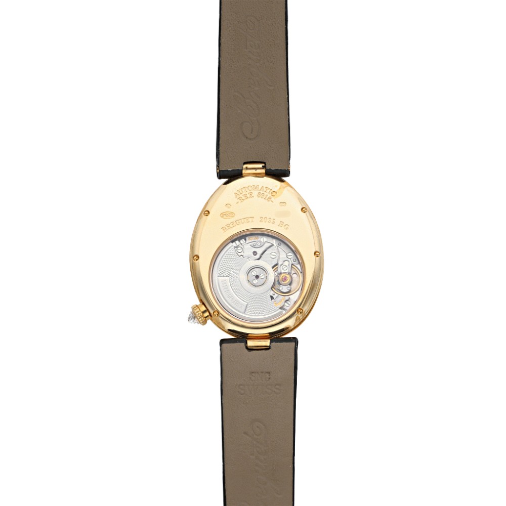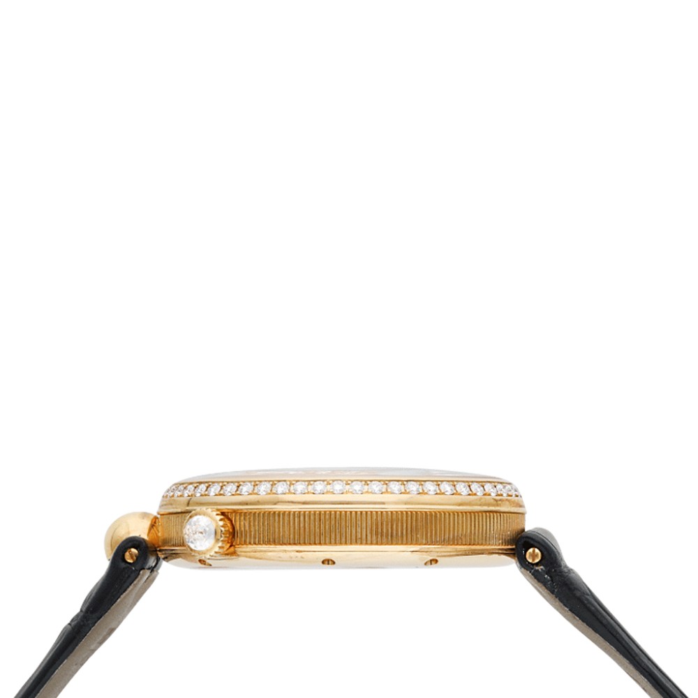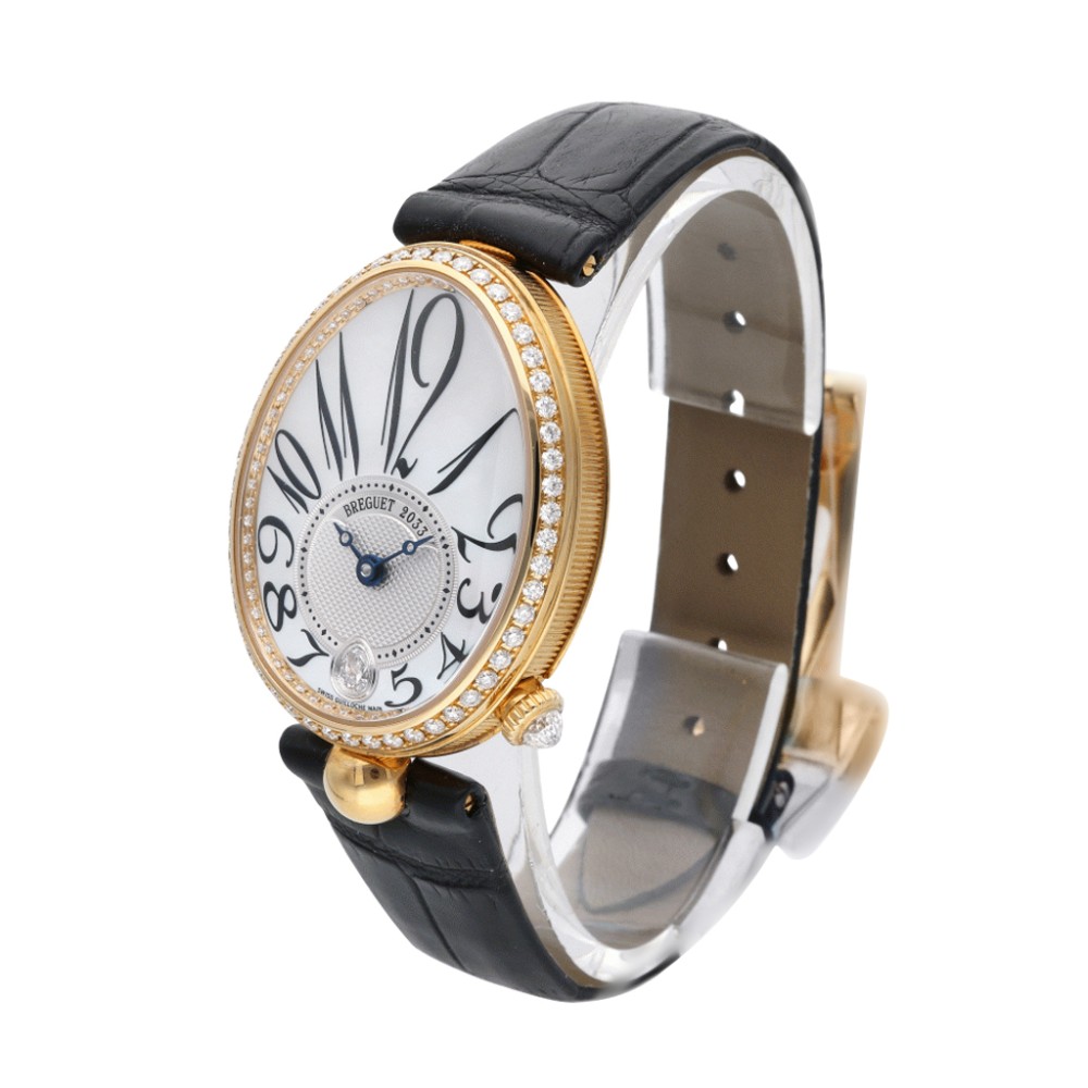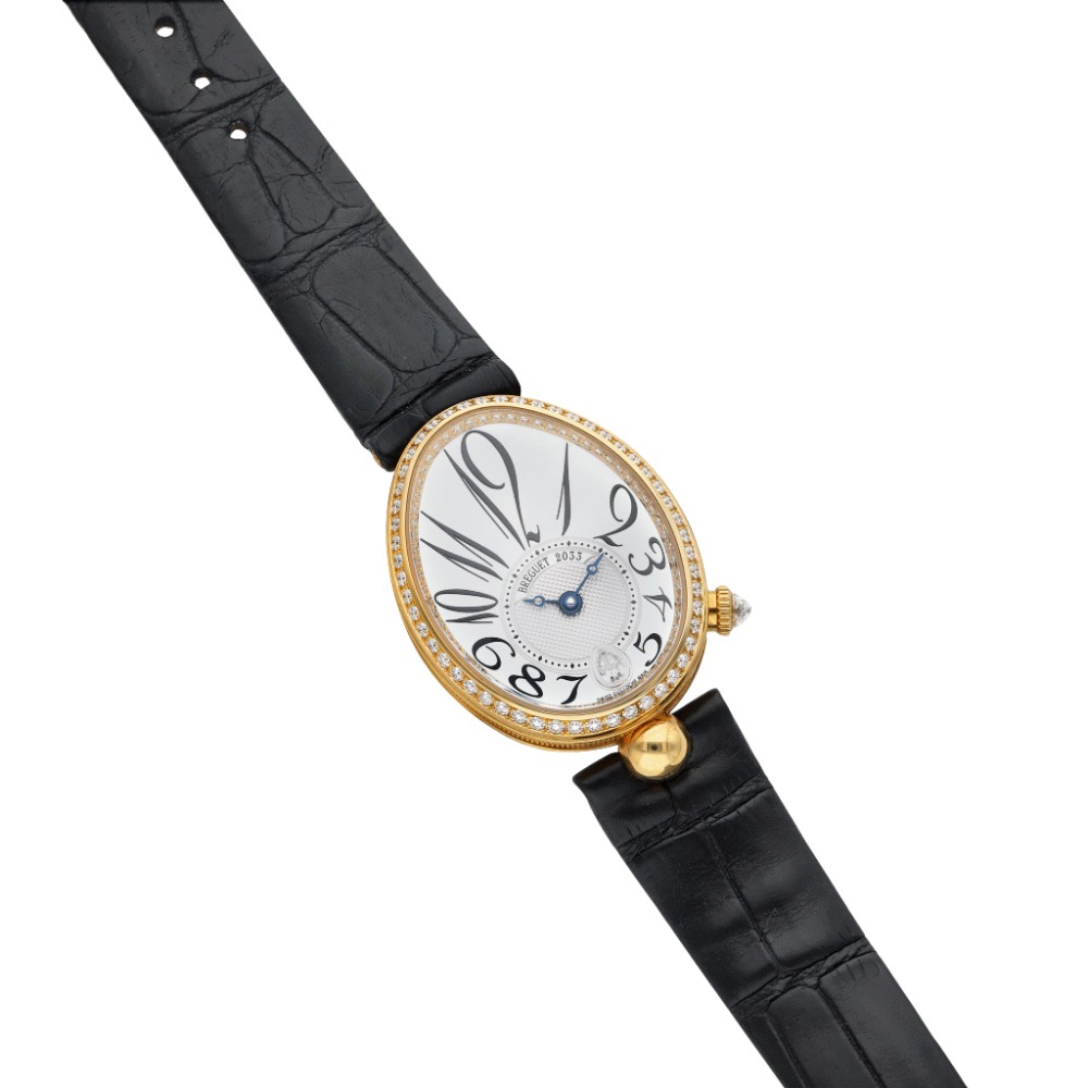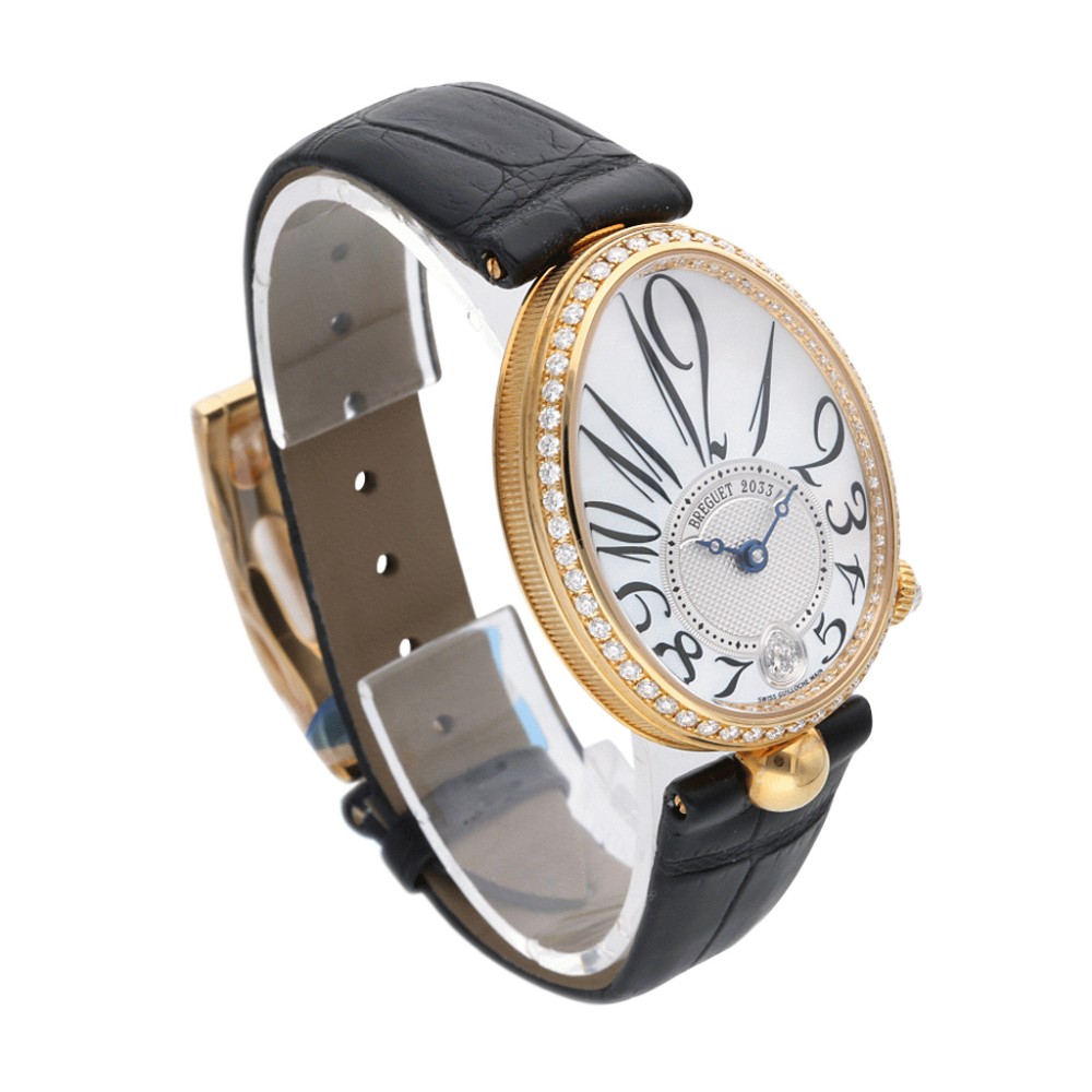 Easily recognizable from its ovoid shape and decorative dial, Breguet’s Reine de Naples collection was inspired by an early design by Abraham-Louis Breguet, made for Napoleon Bonaparte?s sister Caroline, Queen of Naples. This model features a yellow gold case set with brilliant cut diamonds, beautifully framing the iridescent mother-of-pearl dial complemented with a pop of blue from the iconic Breguet hands. Undoubtedly elegant, this classically beautiful timepiece incorporates contemporary design features, making it the perfect companion for any occasion.