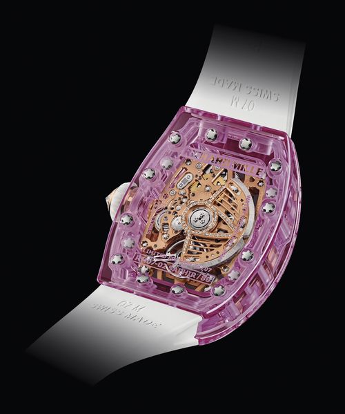 The RM 07-02 Automatic Sapphire brings a feminine approach to technique, cloaking it with divine tones while maintaining transparency. We needed to preserve the transparency while adding a shade of colored, elegant but sufficiently marked.
