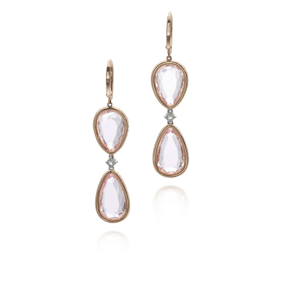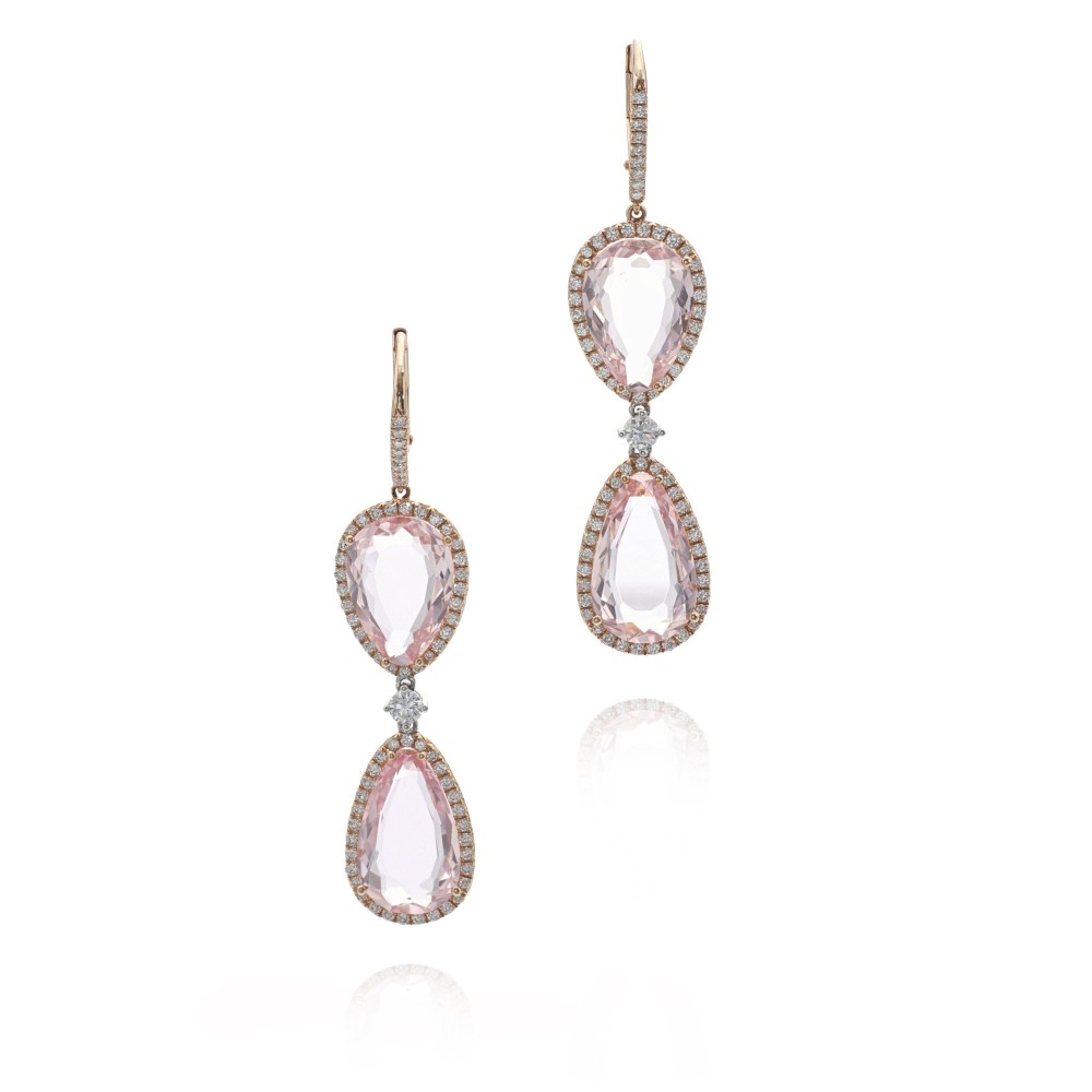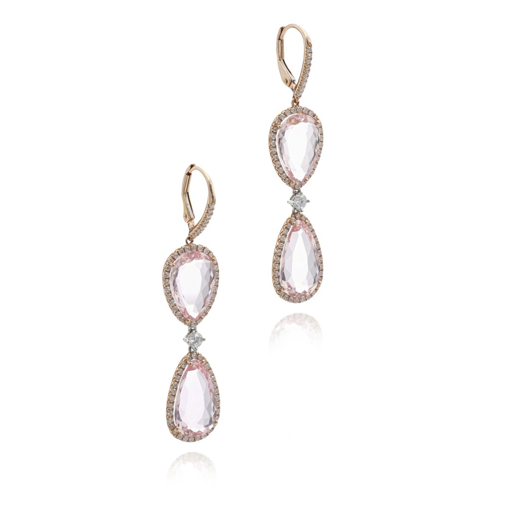 Each set with a pear-shaped morganite framed by a line of single-cut diamonds, the surmounts similarly set.