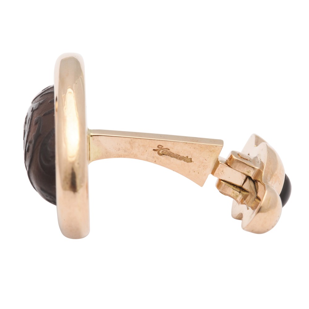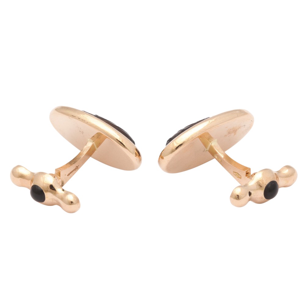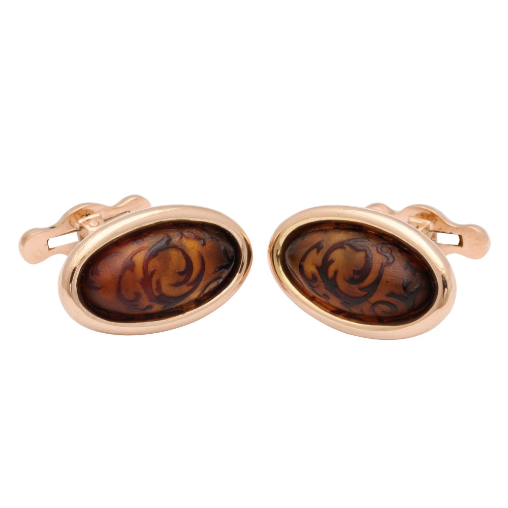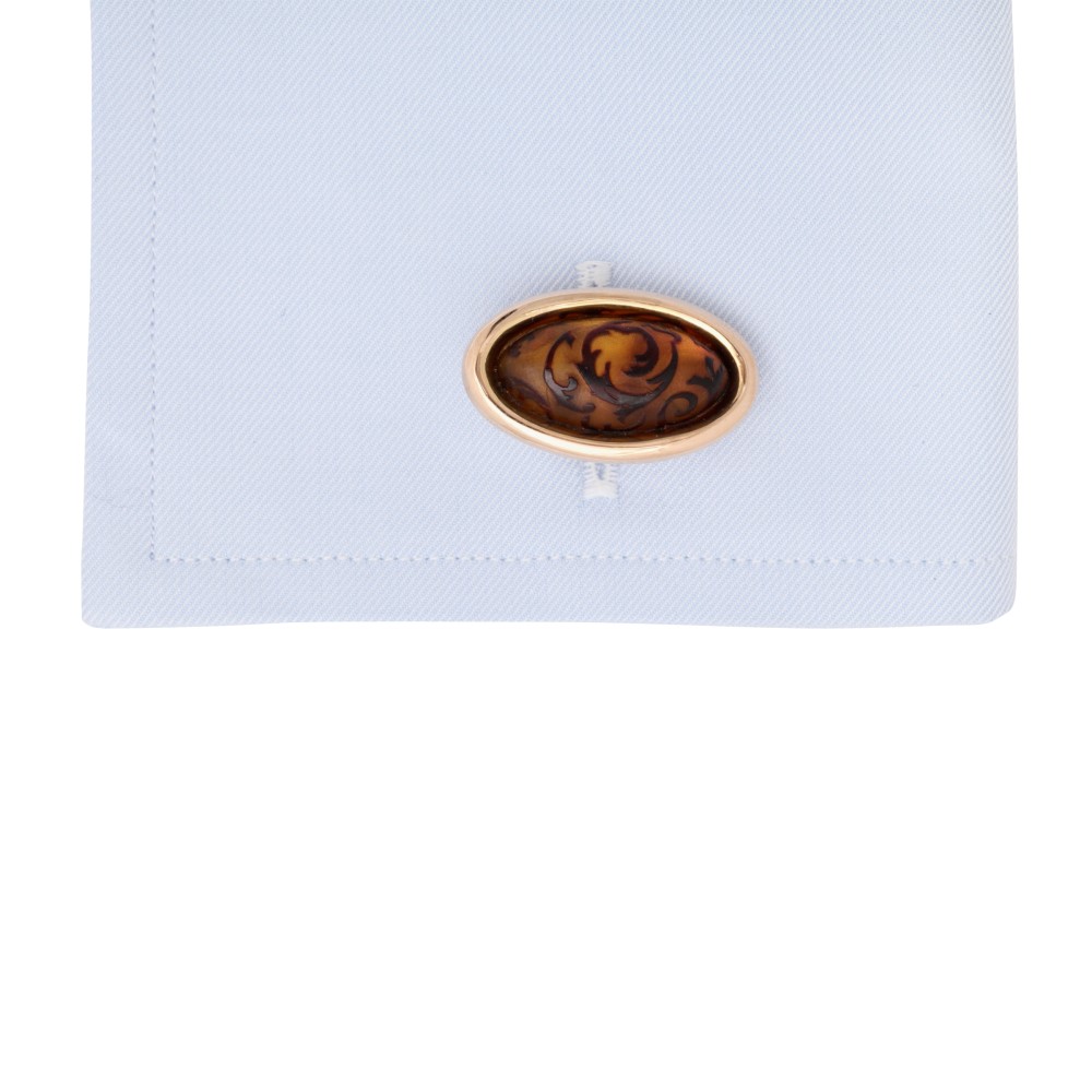 Set with hand-carved amber and black onyx cabochon set spring backs.