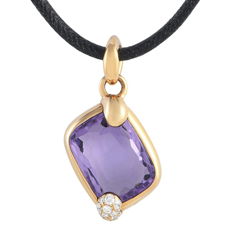 Featuring tilted-set amethyst, accented by pav?-set diamonds, hanging on a black cord.