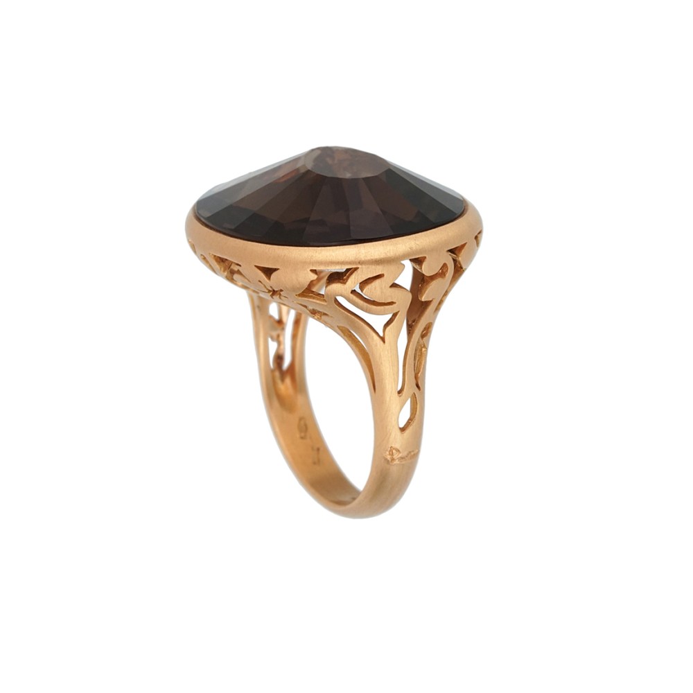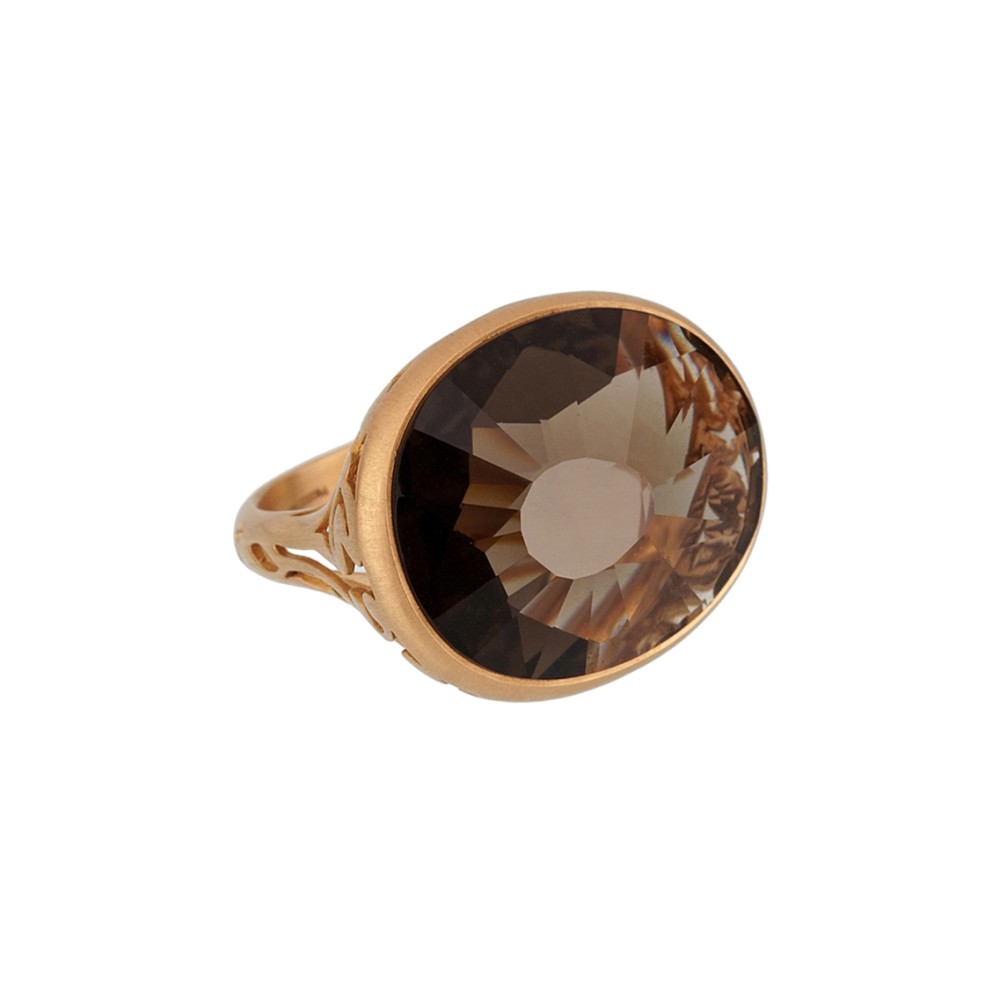 Centering a faceted oval-shaped smoky quartz.