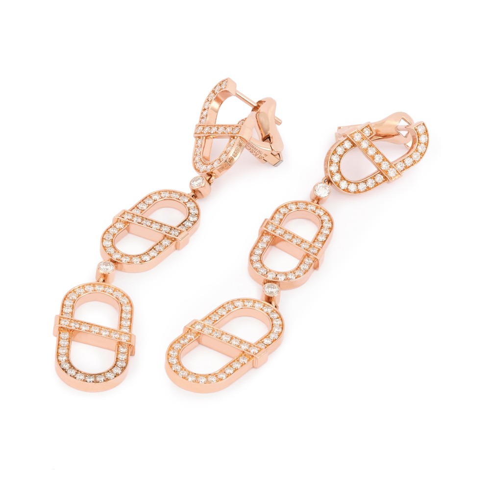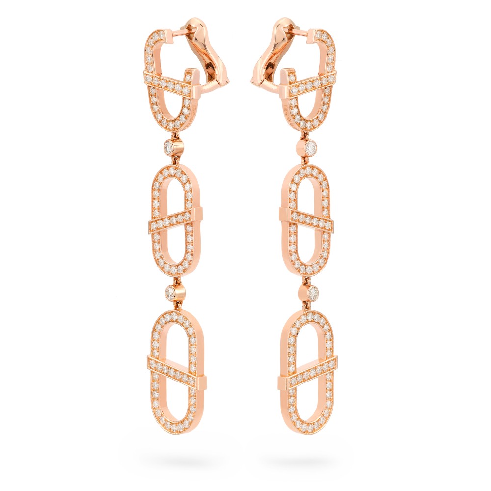 “Vitamin Pink” diamond drop earrings by Karina Choudhrie, each comprising three graduated oblong-shaped open links highlighted with 90 round diamonds.