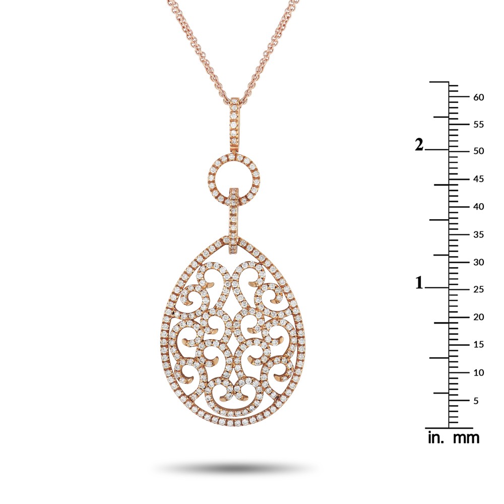Featuring a pear-shaped pendant with filigree design detail, set with round brilliant-cut diamonds.