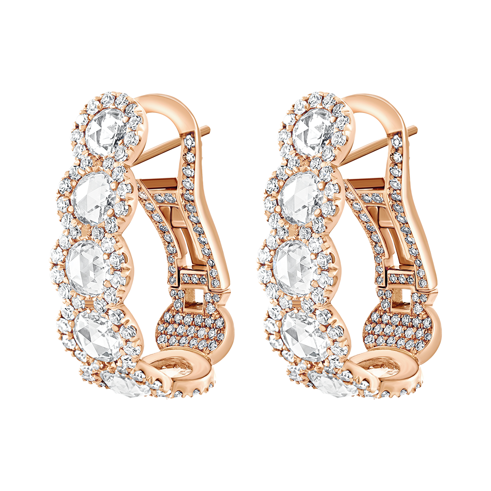 Featuring 6 round rose-cut diamonds on each, surrounded by round brilliant cut diamonds, additional round diamonds set on ear backs.