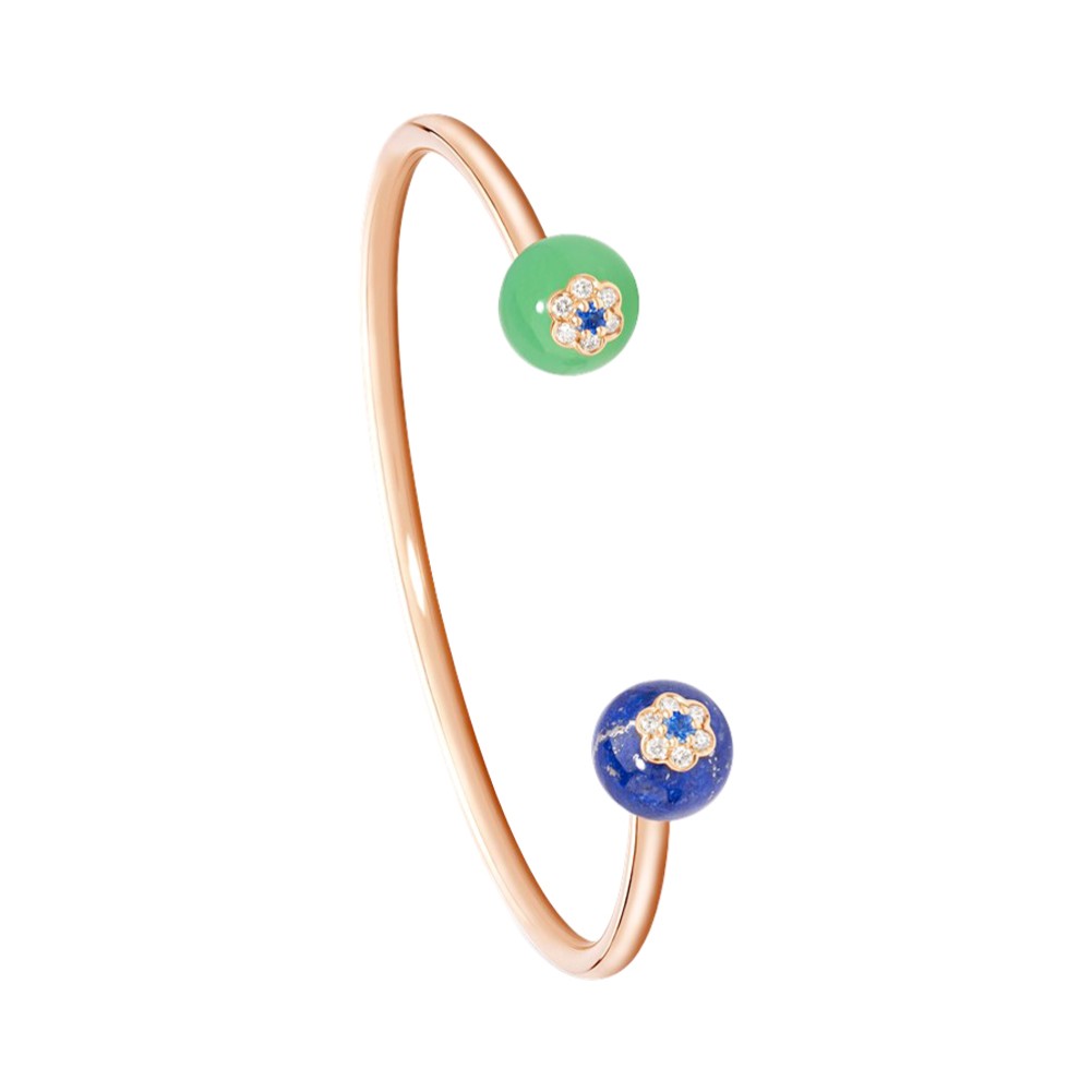 Set of green chrysoprase bead and a lapis lazuli bead with 2 flower motifs on each end, set with round diamonds and 2 round sapphires.