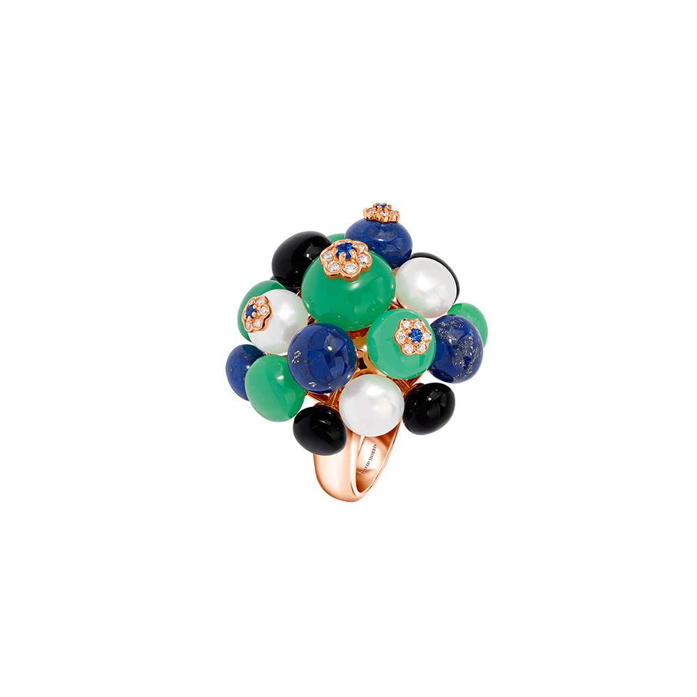 Composed of cultured pearls, chrysoprase beads, lapis lazuli beads and onyx beads, accented by flower motifs, set with round diamonds and sapphires.