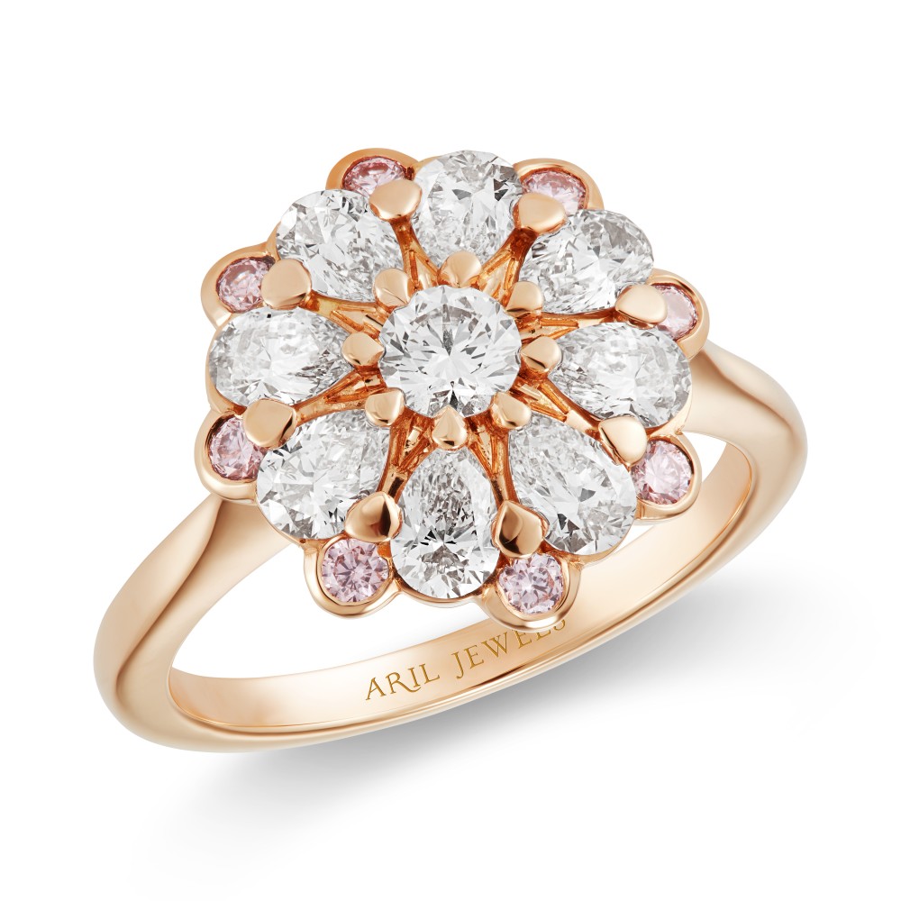 Inspired by Elizabethan England and floral motifs, composed of 8 round pink diamonds in a rub-over setting, 8 pear-shaped diamonds and 1 round diamond claw-set to the center.