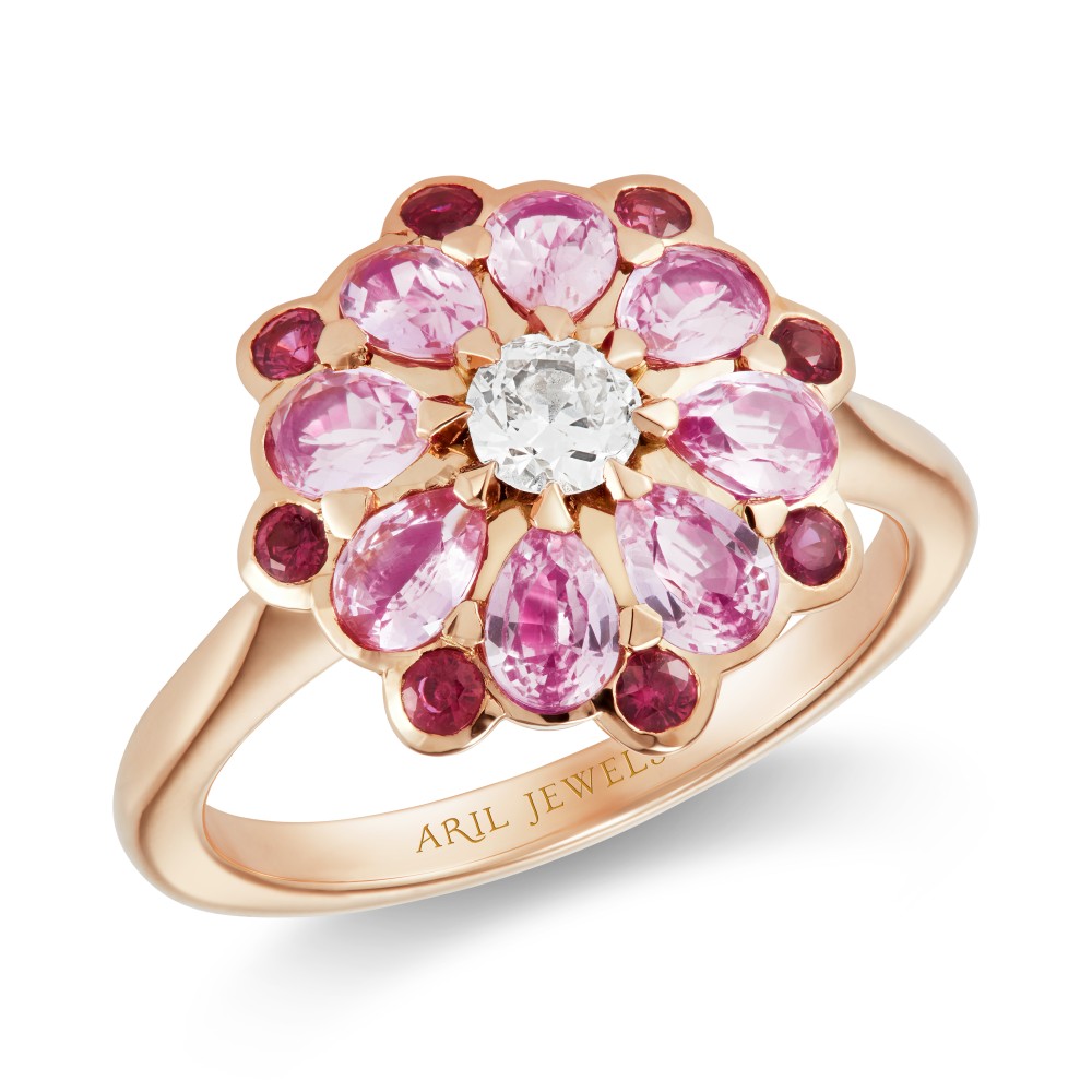 Inspired by Elizabethan England and floral motifs, composed of 8 round rubies in rub-over setting, 8 pink sapphires and 1 old-cut diamond claw-set to the center.