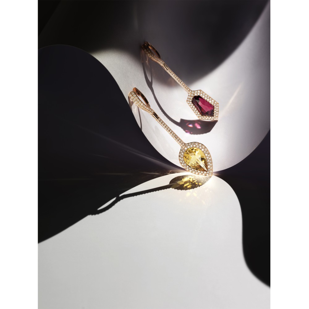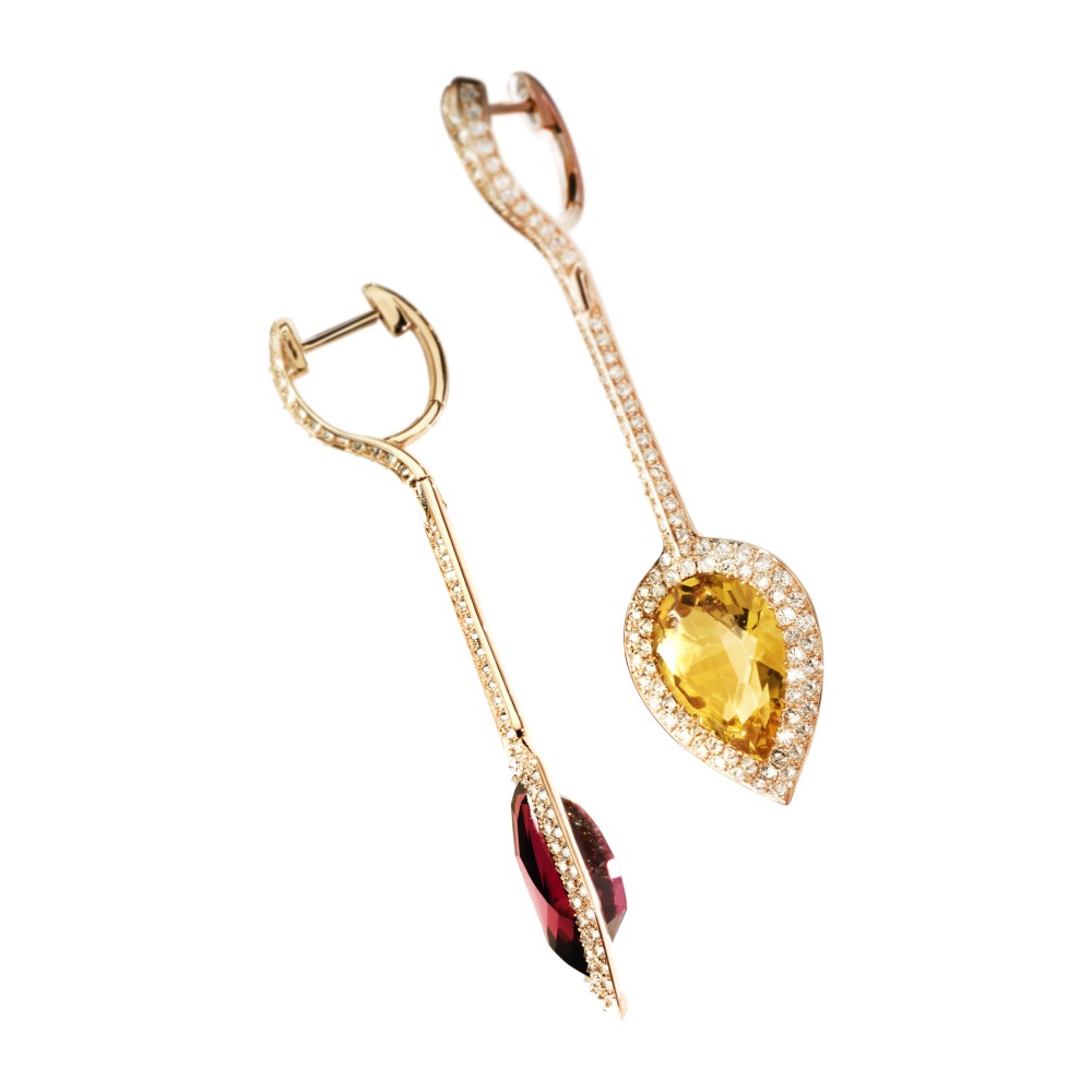 One set with a teardrop garnet and another with a teardrop beryl, accented by brilliant cut diamonds.