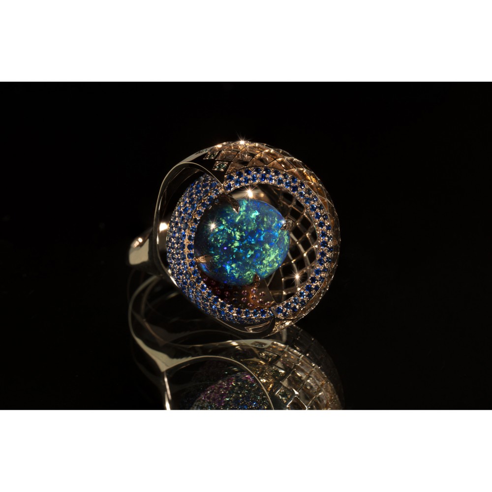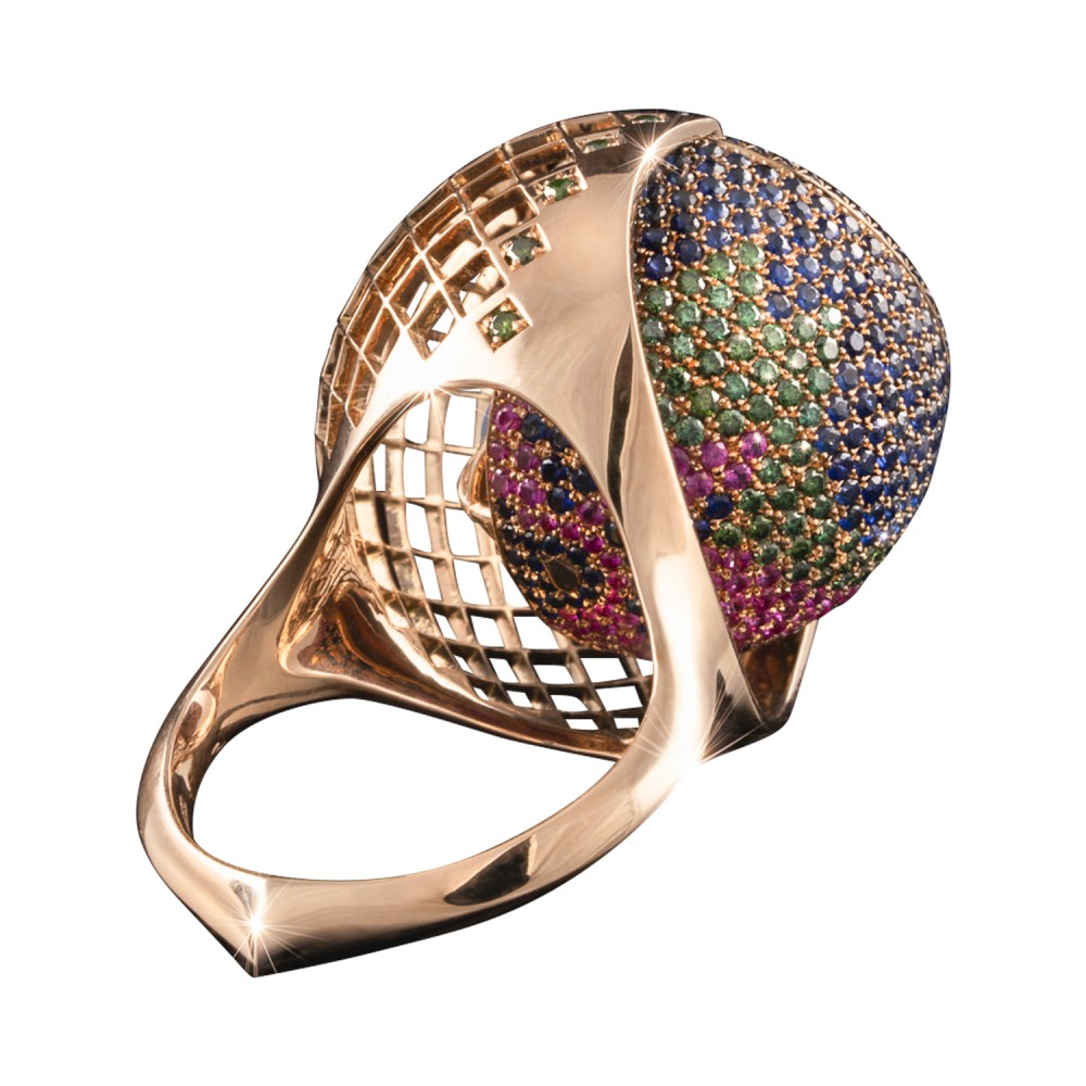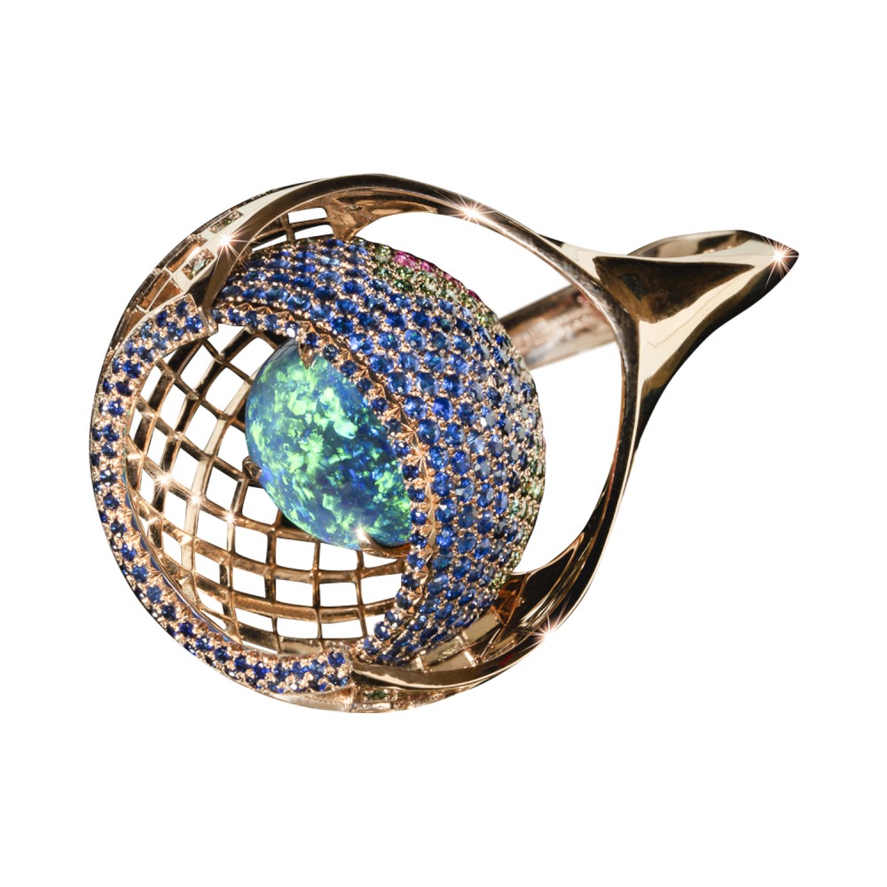Centering a Lightning Ridge Black Opal, with a half latticework sphere dissolving into the jewel accented by blue and pink sapphires, rubies and green diamonds.