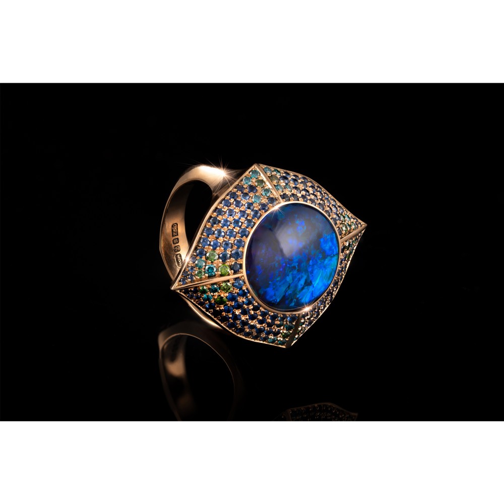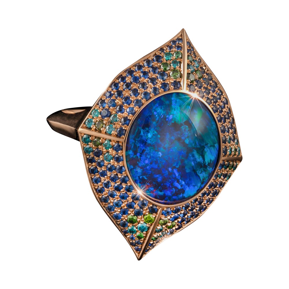 Centering a Lightning Ridge black opal, accented by pav?-set blue sapphires and green diamonds.