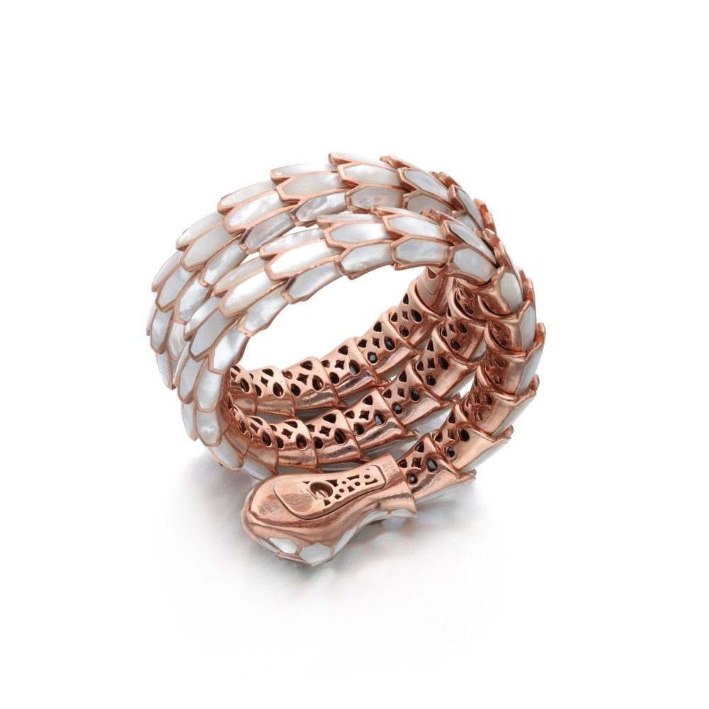 Composed of round brilliant-cut diamonds, accented by marquise-shaped emeralds, enhanced by mother-of-pearl inlay.