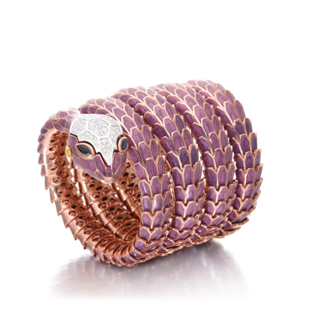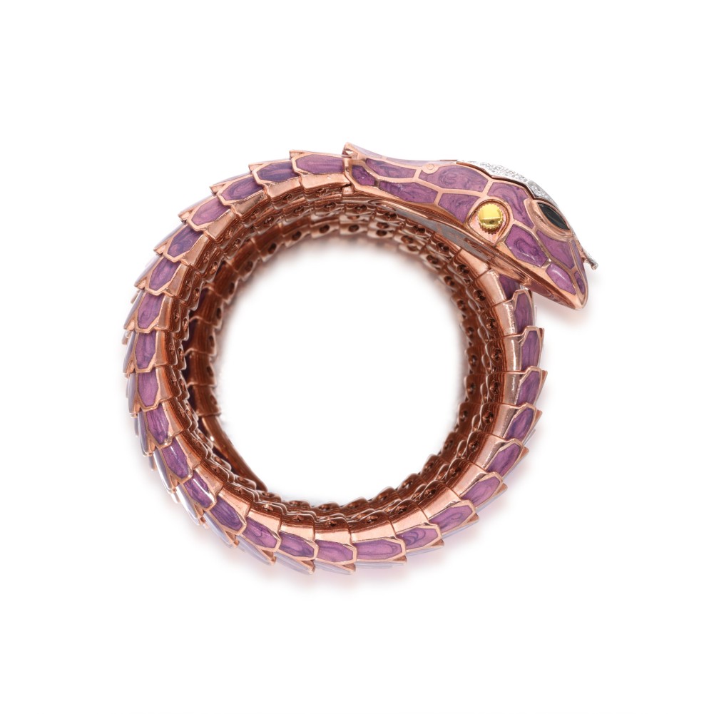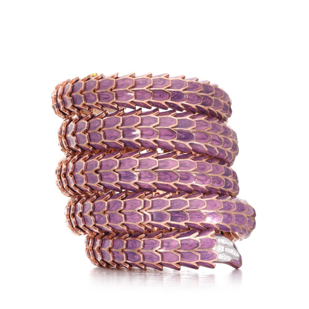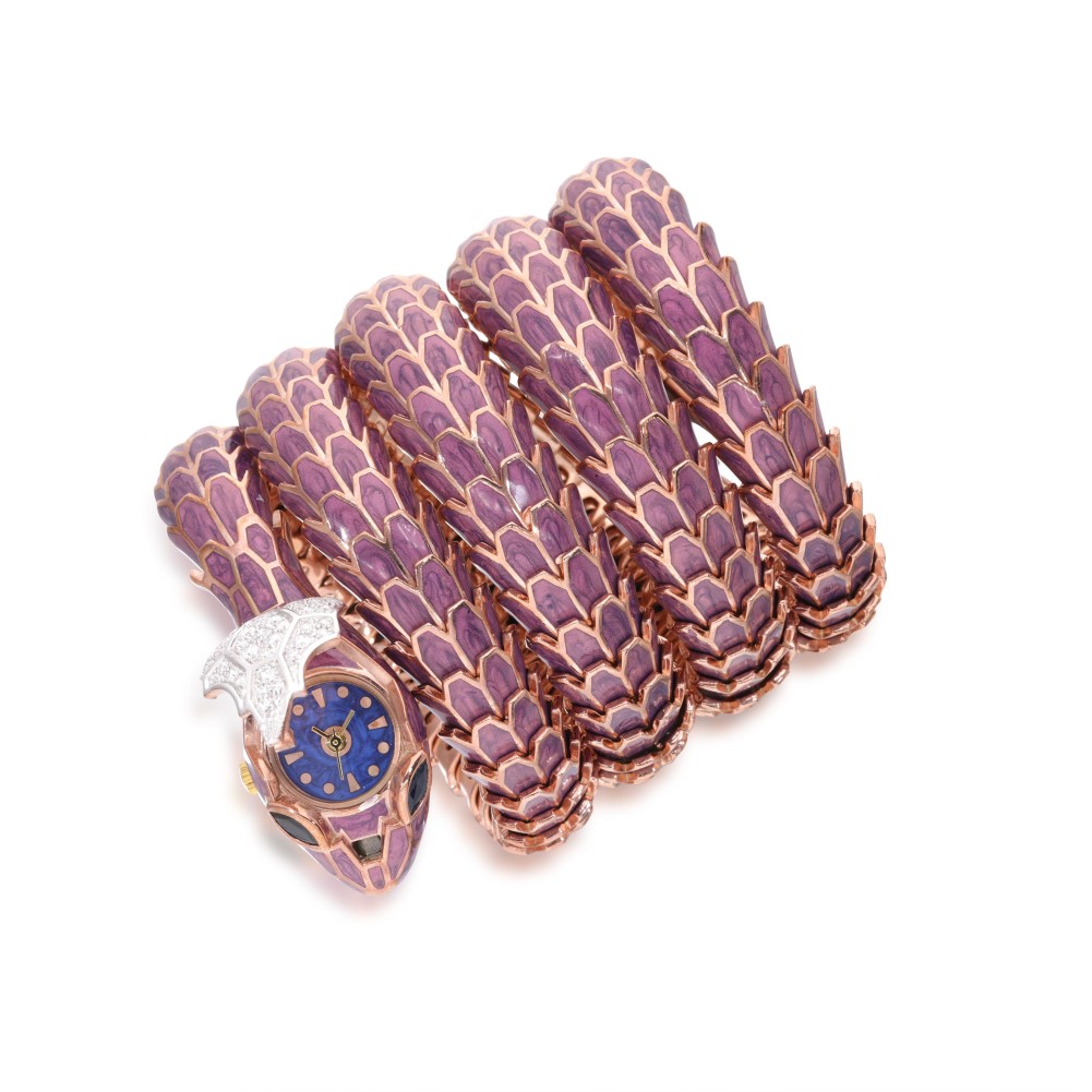 Composed of round brilliant-cut diamonds, accented by marquise-shaped sapphires, enhanced by purple enamel.