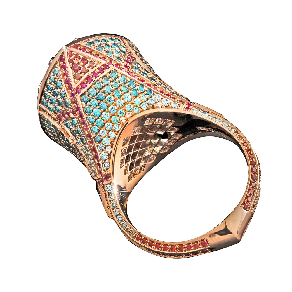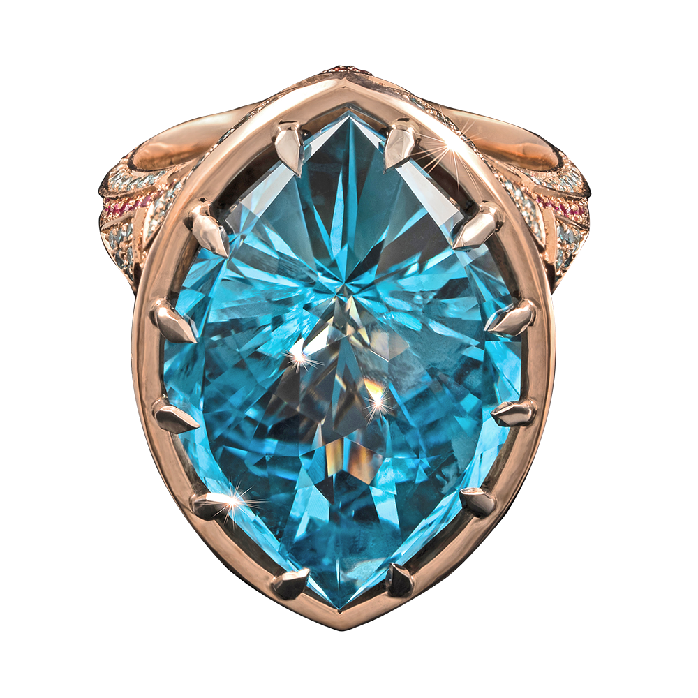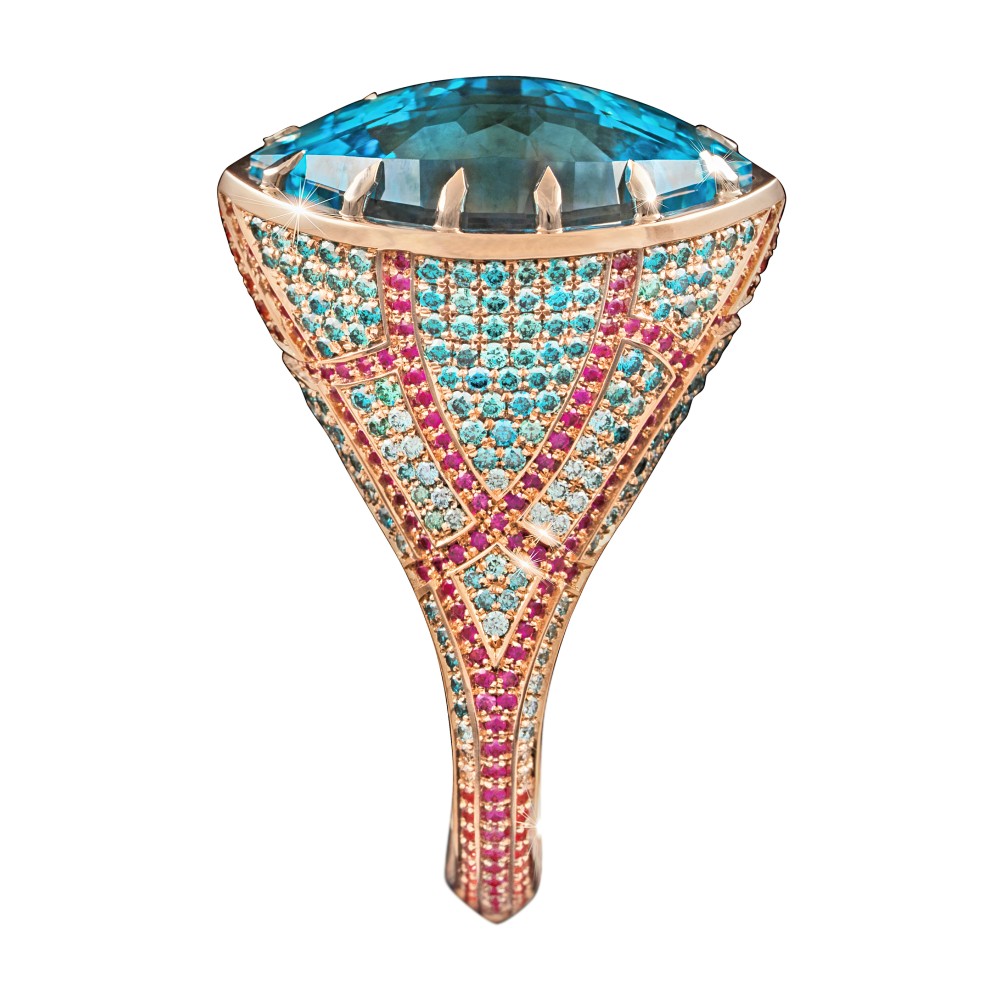 Centering a sky blue topaz, accented by 731 pav? set rubies, blue diamonds and orange sapphires.
